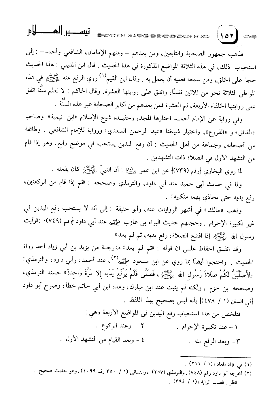 واحتجوا أيضا بما روى عن ابن مسعود، عند أحمد، وأبي داود، والترمذيٍ "لأصليَنَّ لَكُمْ صَلاةَ رَسُولِ الله صلى الله عليه وسلم، فَصَلى فَلَم يَرْفعْ يَدَيْهِ إِلا مَرة وَاحِدَةً " حسنه الترمذي، وصححه ابن حزم. ولكنه لم يثبت عند ابن مبارك، وعده ابن أبي حاتم خطأ، وصرح أبو داود بأنه ليس بصحيح بهذا اللفظ. فتلخص من هذا استحباب رفع اليدين في المواضع الأربعة وهي: