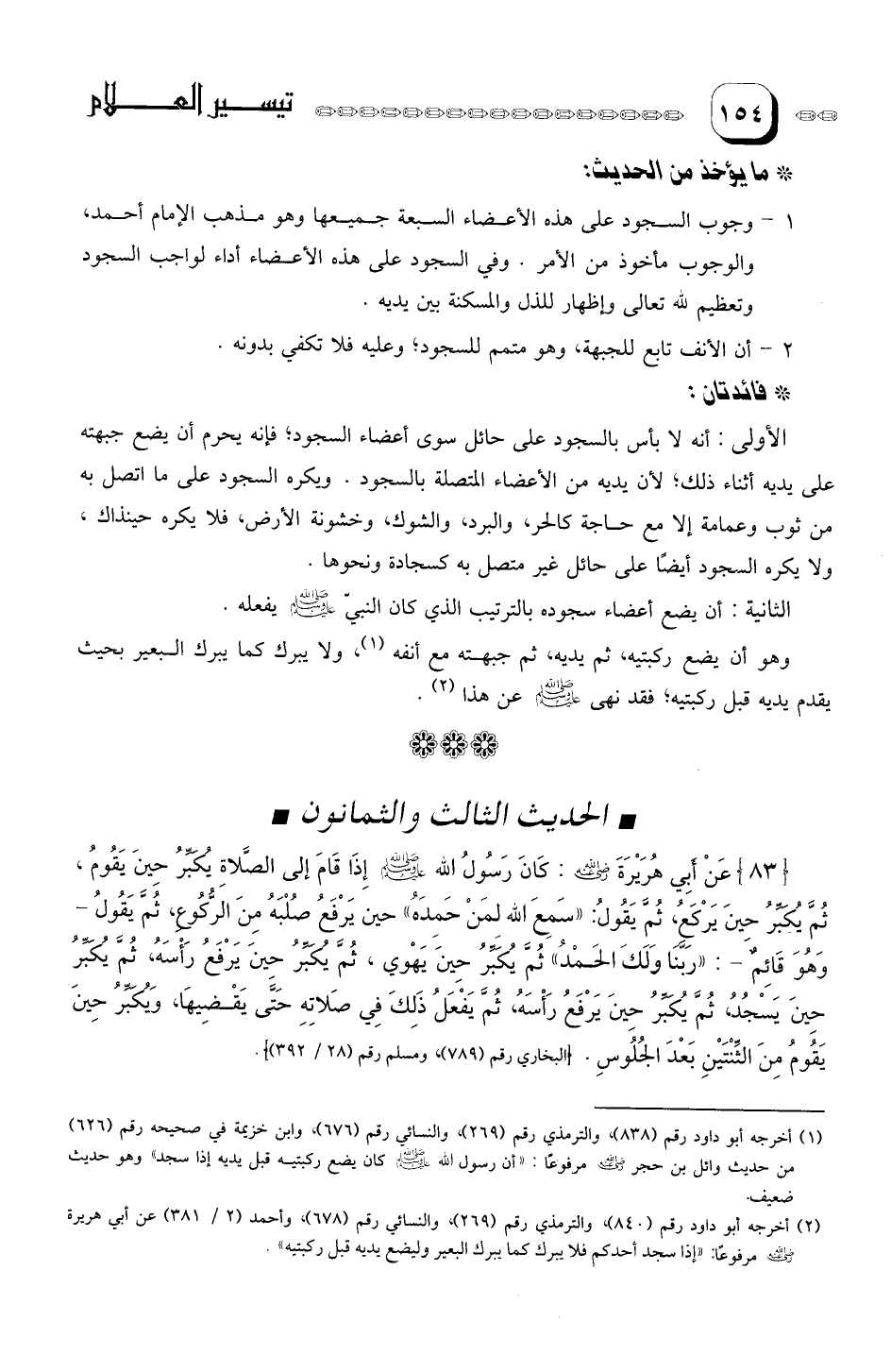 1- وجوب السجود على هذه الأعضاء السبعة جميعها وهو مذهب الإمام أحمد، والوجوب مأخوذ من الأمر. وفي السجود على هذه الأعضاء أداء لواجب السجود وتعظيم لله تعالى وإظهار للذل والمسكنة بين يديه.