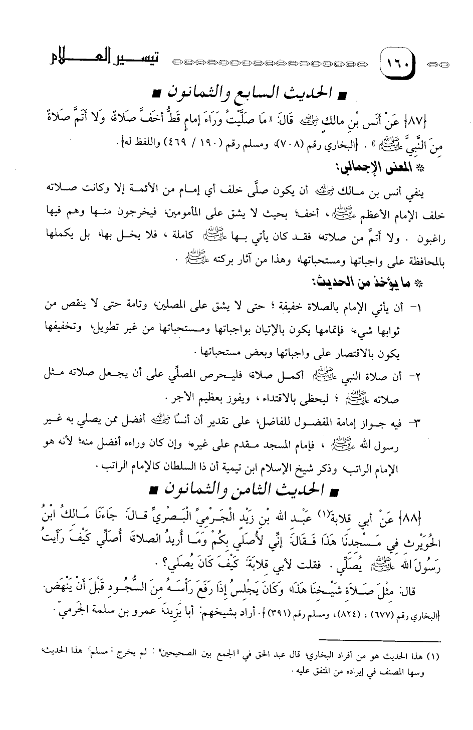 عَنْ أنَس بن مَالِك رضيَ الله عَنْهُ قَالَ: " مَا صَليتُ وَرَاءَ إِمَام قَطّ أخَف صَلاة وَلا أتَمَّ صَلاة مِنَ النبي صَلًى الله عَلَيْهِ وَسَلّمَ ".
