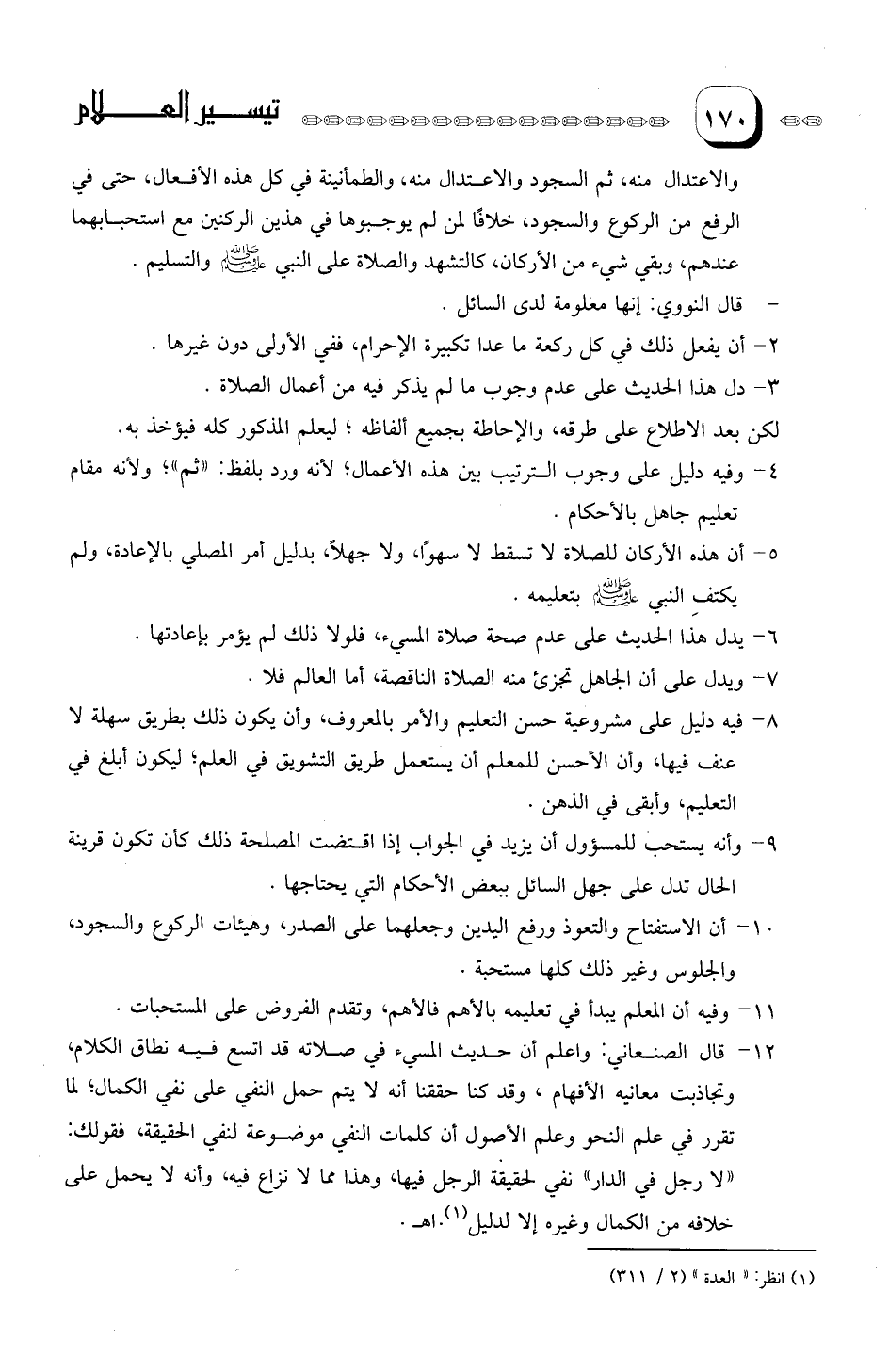 12- قال الصنعاني: واعلم أن حديث المسيء في صلاته قد اتسع فيه نطاق الكلام، وتجاذبت معانيه الأفهام، وقد كنا حققنا أنه لايتم حمل النفي فيه على نفي الكمال، لما تقرر في علم النحو وعلم الأصول، أن كلمات النفي موضوعة لنفي الحقيقة، فقولك "لا رجل في الدار" نفي لحقيقة الرجل فيها، وهذا مما لا نزاع فيه، وأنه لا يحمل على خلافه من الكمال وغيره إلا لدليل. اهـ.