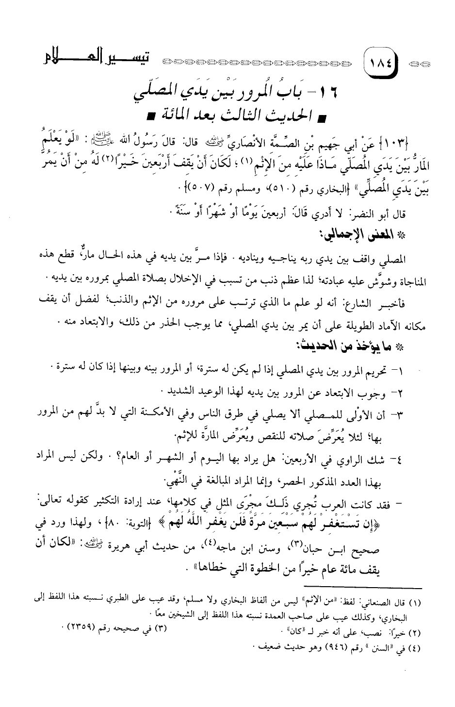 قَالَ رَسُولُ الله صلى الله عليه وسلم: " لَوْ يَعْلَمُ الْمَارُّ بَيْنَ يَدَيِِ الْمُصلِّى مَاذَا عَلَيْهِ مِنَ الإثْمِ (¬1) لَكَانَ أنْ يَقِفَ أربَعِينَ خَيْراً (¬2) لَهُ من أنْ يَمُرَّ بَيْنَ يَدَي الْمُصلي".