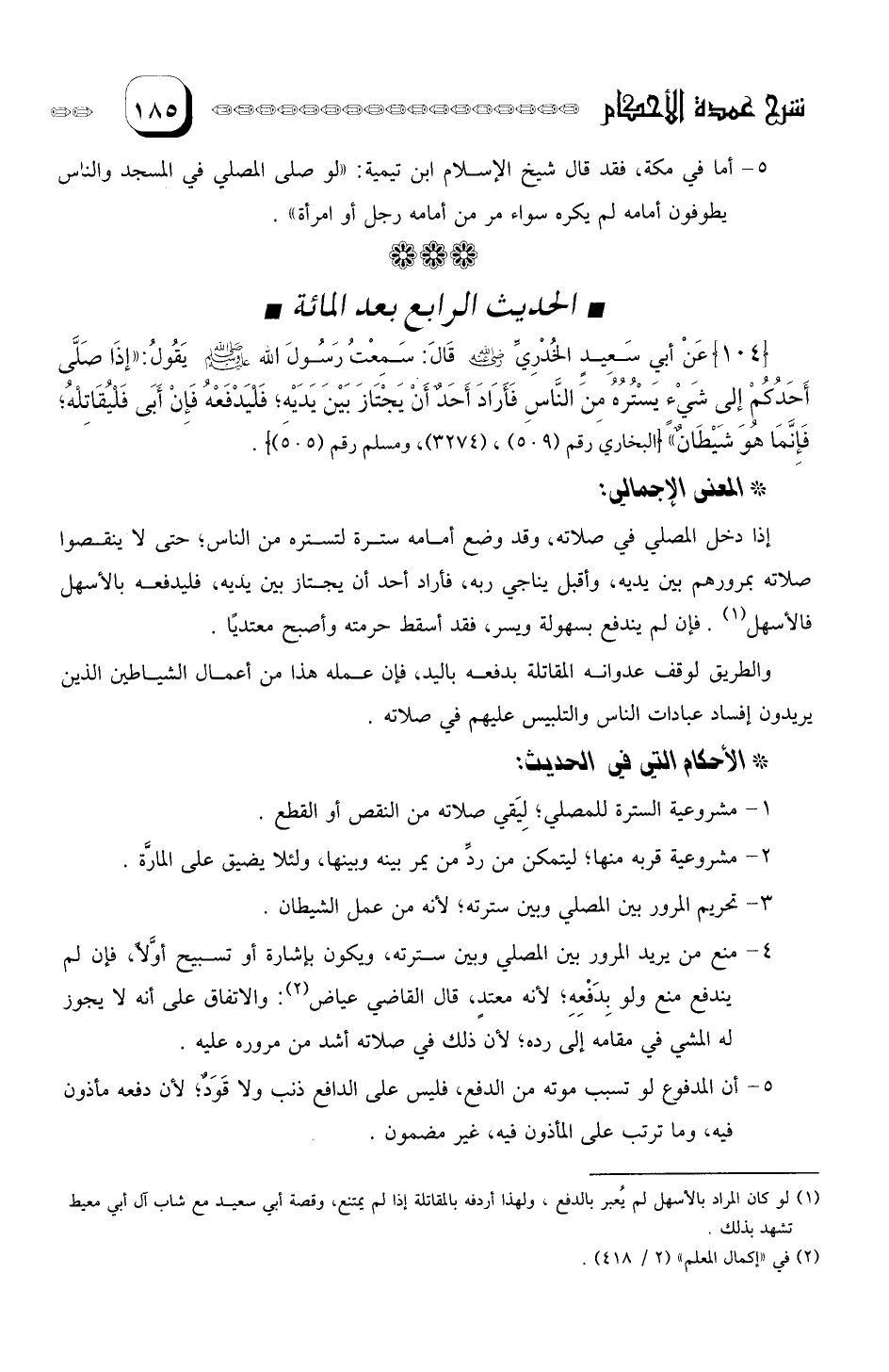 4- منع من يريد المرور بين المصلى وبين سترته، ويكون بإشارة أو تسبيح أوَّلاً، فإن لم- يندفع، منع ولو بِدَفعه، لأنه معتدٍ. قال القاضي عياض: والاتفاق على أنه لا يجوز له المشي في مقامه إلى رده، لأن ذلك في صلاته أشد من مروره عليه.