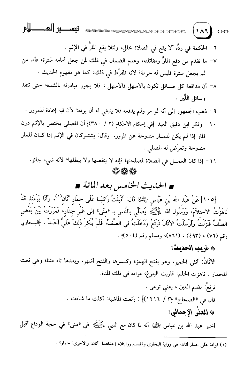 عَنْ عَبْدِ الله بْنِ عَبَّاس ورَضىَ الله عَنْهُمَا قال: أقْبَلْتُ رَاكِبا عَلَى حِمَارٍ أتَانٍ (¬1) ، وَأنَا يَوْمَئِذٍ قَدْ نَاهَزْتُ الاحْتِلامَ، وَرَسُول الله صلى الله عليه وسلم يُصَلّي بالْنَّاس بـ"مِنىً" إِلى غيْر جِدَارٍ، فَمَرَرتُ بيْنَ بَعْض الصَّف فَنَزَلْتُ وَأرْسَلْتُ الأتانَ تَرْتَعُ وَدَخَلْتُ في الصَّفَ، فَلَمْ يُنْكِرْ ذلِكَ عَليَّ أحَدٌ.