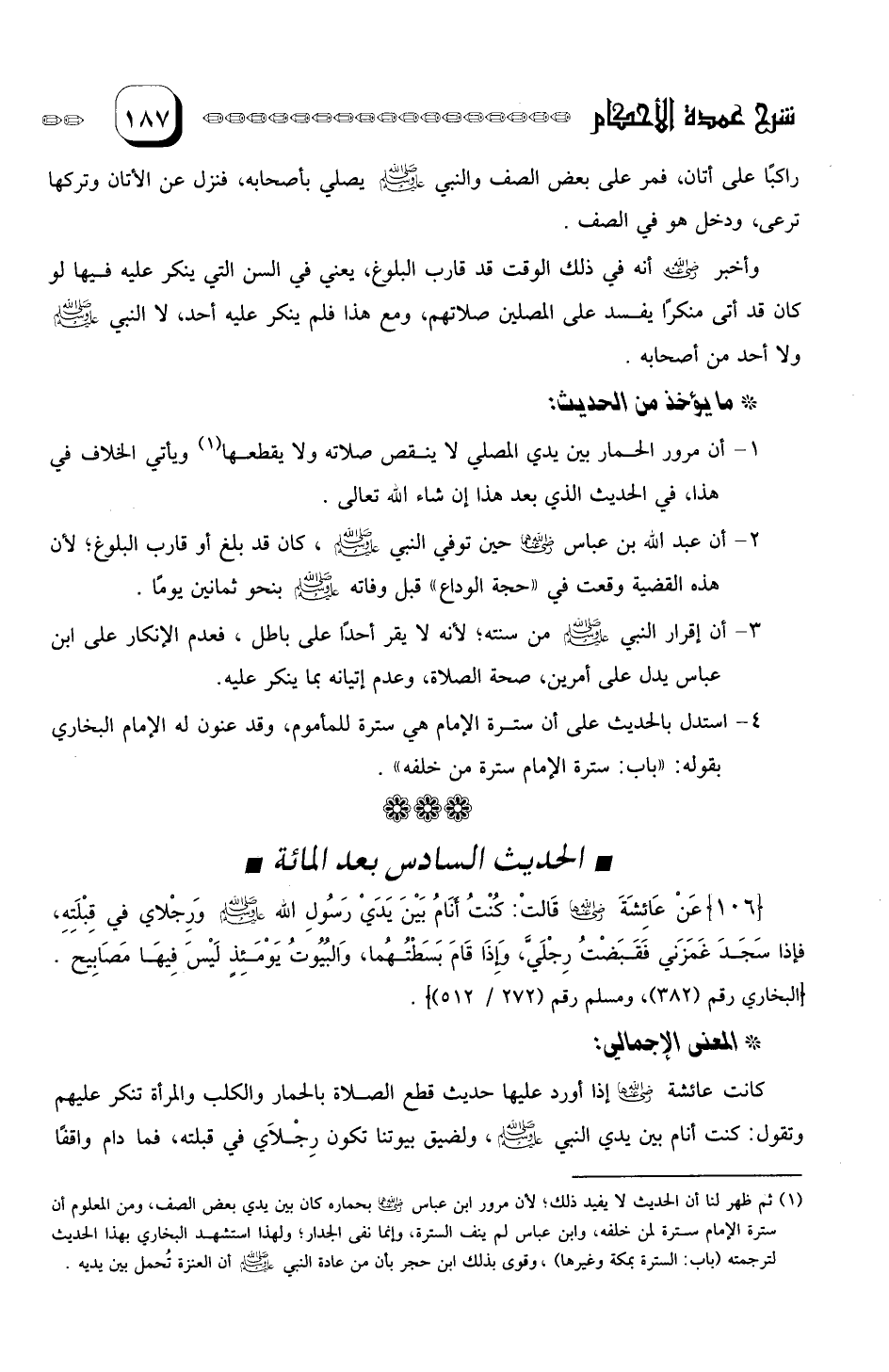 1- أن مرور الحمار بين يدي المصلى لا ينقص صلاته ولا يقطعها. ويأتي الخلاف في هذا، في الحديث الذي بعد هذا إن شاء الله تعالى.