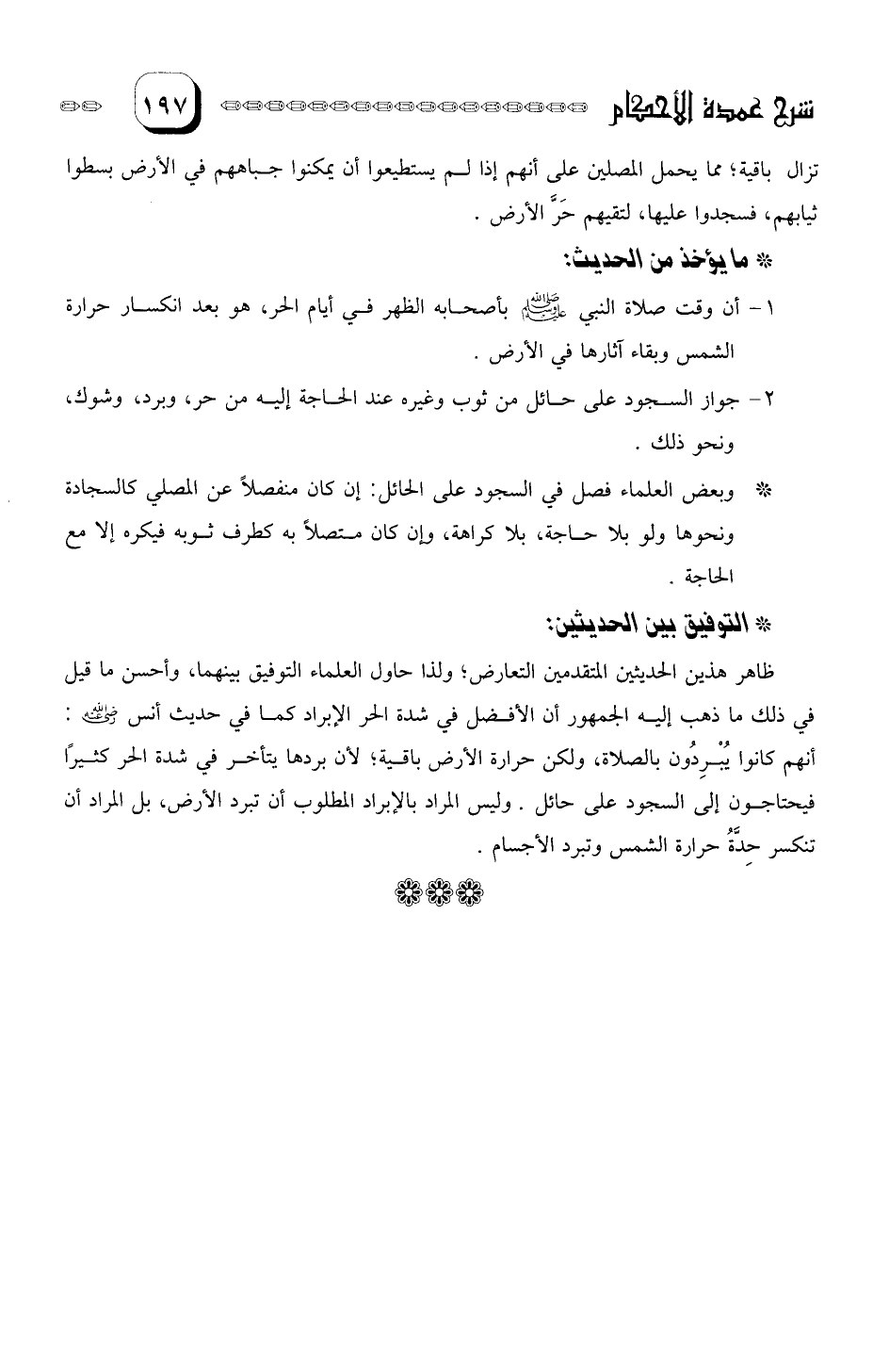 وأحسن ما قيل في ذلك، ما ذهب إليه الجمهور أن الأفضل في شدة الحر الإبراد كما في حديث أنس: أنهم كانوا يُبْرِدُوْنَ بالصلاة، ولكن حرارة الأرض باقية لأن بردها يتأخر في شدة الحر كثيرا فيحتاجون إلى السجود على حائل.