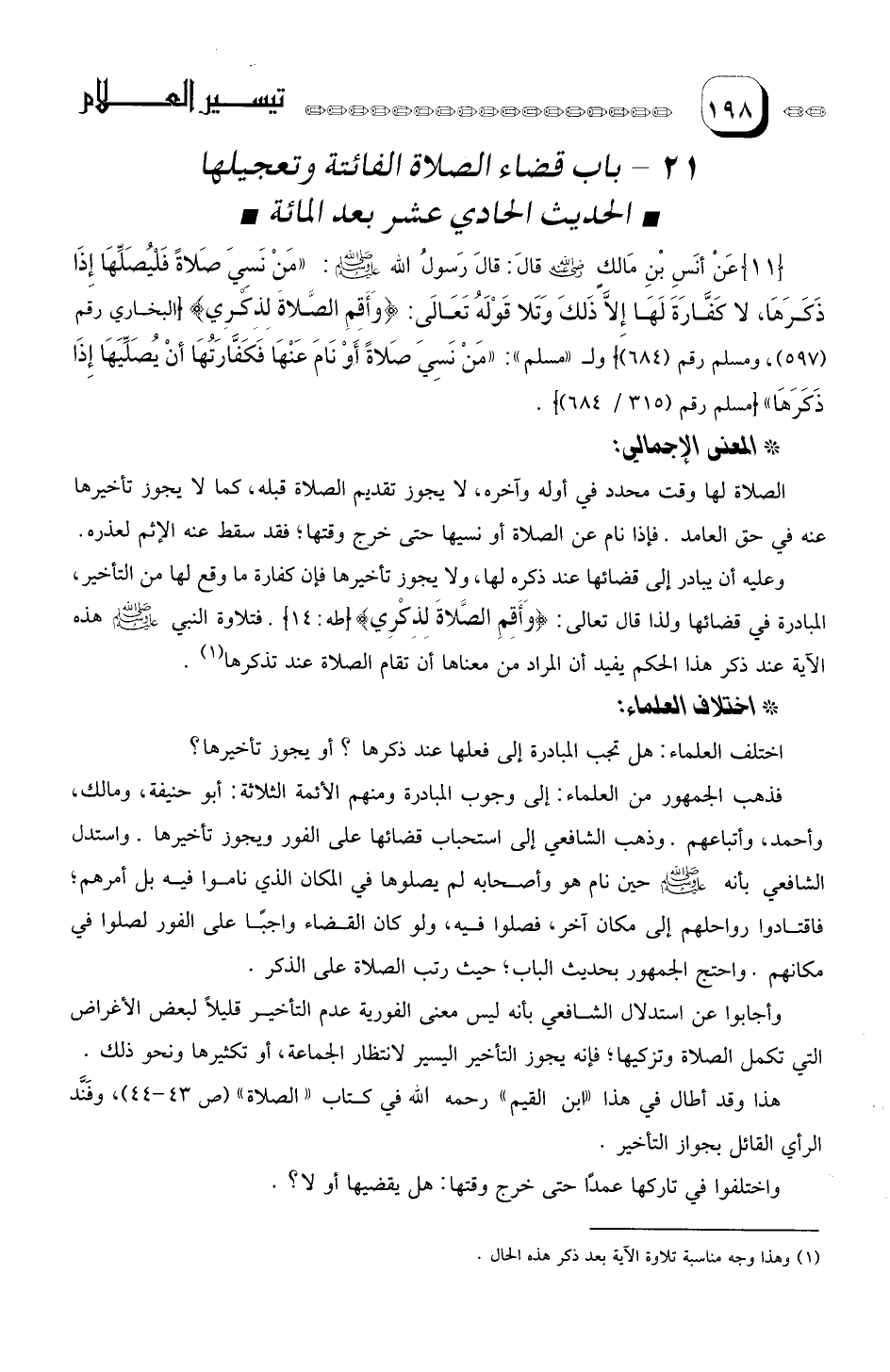 هذا وقد أطال في هذا " ابن القيم " رحمه الله في كتاب " الصلاة " وفنَّد الرأي القائل بجواز التأخير.