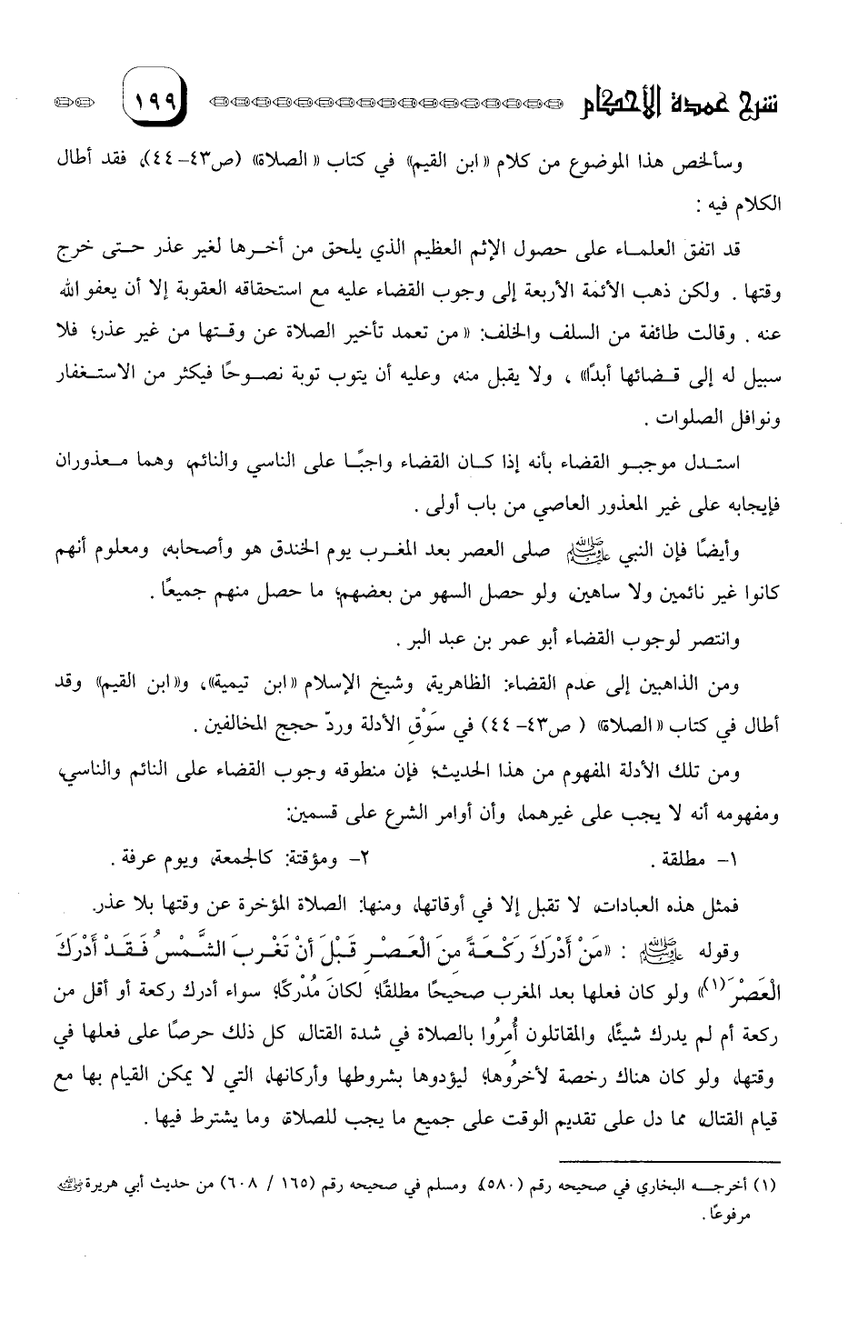وقوله صلى الله عليه وسلم" مَنْ أدرَكَ ركعةً مِنَ العَصرِ قَبْلَ أنْ تَغْرُبَ الشمسُ فَقَدْ أدرَكَ العَصرَ" ولو كان فعلها بعد المغرب صحيحاً مطلقاً، لكان مُدرِكاً، سواء أدرك ركعة أو أقل من ركعة، أم لم يدرك شيئاً، والمقاتلون أُمِرُوا بالصلاة في شدة القتال، كل ذلك حرصا على فعلها في وقتها، ولو كان هناك رخصة لأخرُوها، ليؤدوها بشروطها وأركانها، التي لا يمكن القيام بها مع قيام القتال، مما دل على تقديم الوقت على جميع ما يجب للصلاة، وما يشترط فيها.