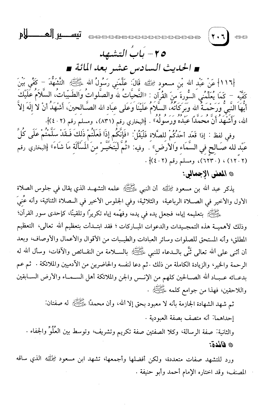 عَنْ عَبْدِ الله بْنِ مَسْعُودٍ رضي الله عَنْهُْ قال: "عَلَّمَني رَسُولُ الله صلى الله عليه وسلم التَّشَهُّدَ- كَفِّى بَيْنَ كفيْهِ- كَما يُعَلِّمُني السُّورَةَ مِنَ الْقُرْآنِ"