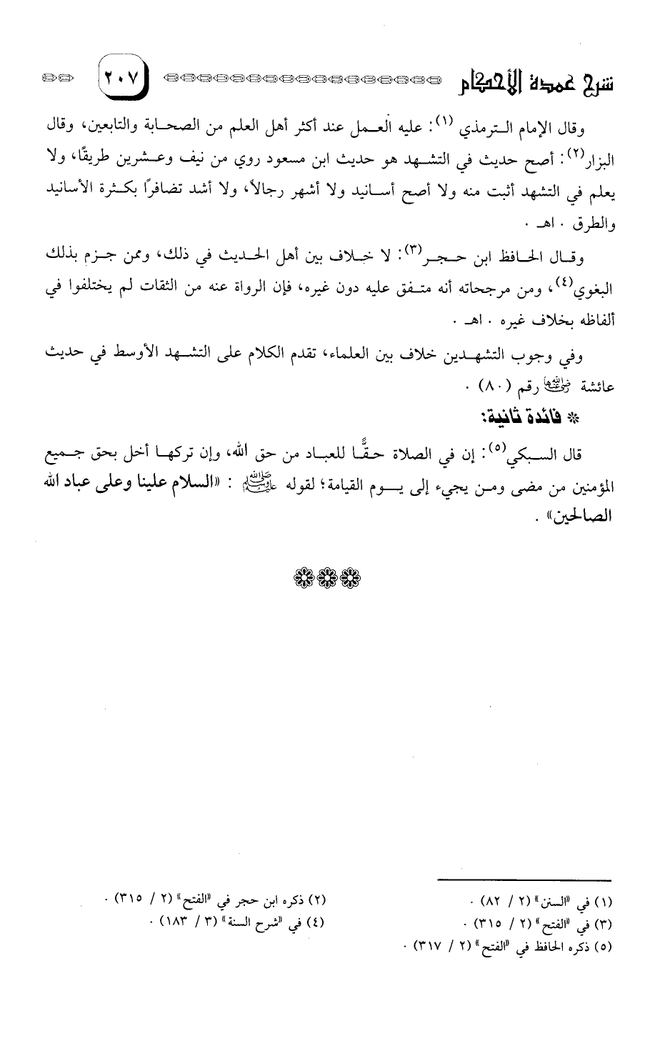 وقال الترمذي: عليه العمل عند أكثر أهل العلم، من الصحابة والتابعين. وقال البزار: أصح حديث في التشهد هو حديث ابن مسعود روي من نيف وعشرين طريقا، ولا يعلم في التشهد أثبت منه ولا أصح أسانيد ولا أشهر رجالا، ولا أشد تضافرا بكثرة الأسانيد والطرق. أهـ وقال ابن حجر: لا خلاف بين أهل الحديث في ذلك. وممن جزم بذلك البغوي، ومن مرجحاته أنه متفق عليه دون غيره، فإن الرواة عنه من الثقات لم يختلفوا في ألفاظه بخلاف غيره. أهـ.