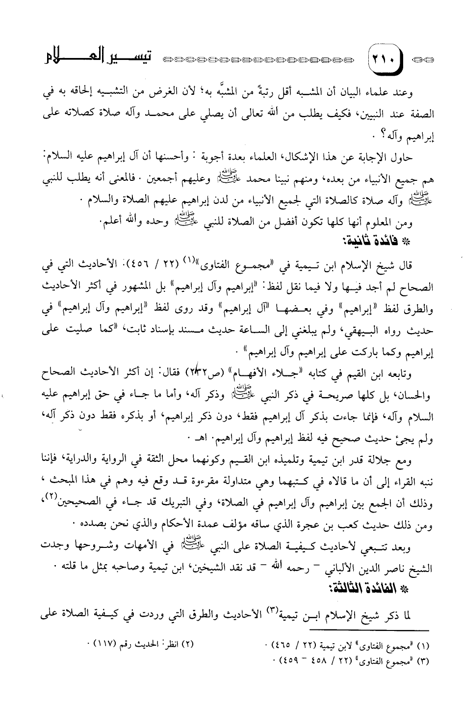 وبعد تتبعي لأحاديث كيفية الصلاة على النبي صلى الله عليه وسلم في الأمهات وشروحها وجدت الشيخ ناصر الدين الألباني قد نقد الشيخين، ابن تيمية وصاحبه بمثل ما قلته.