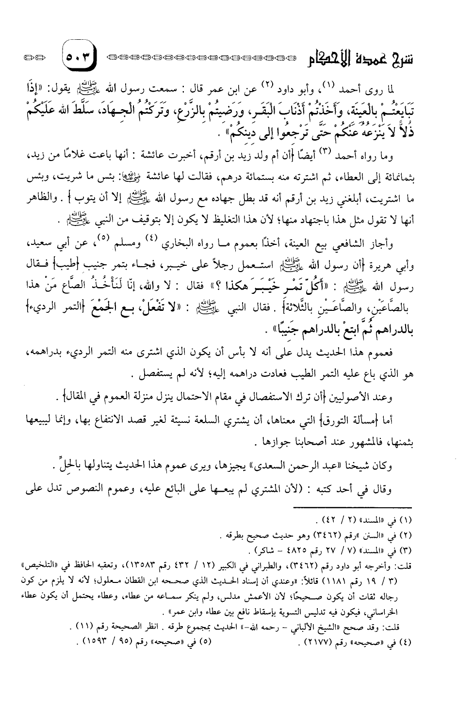 وما رواه أحمد أيضاً [أن أم ولد زيد بن أرقم، أخبرت عائشة: أنها باعت غلاما من زيد، بثمانمائة إلى العطاء، ثم اشترته منه بستمائة درهم، فقالت لها عائشة: بئس ما شريت، وبئس ما اشتريت، أبلغي زيدا بن أرقم أنه قد بطل جهاده مع رسول الله صلى الله عليه وسلم إلا أن يتوب] .