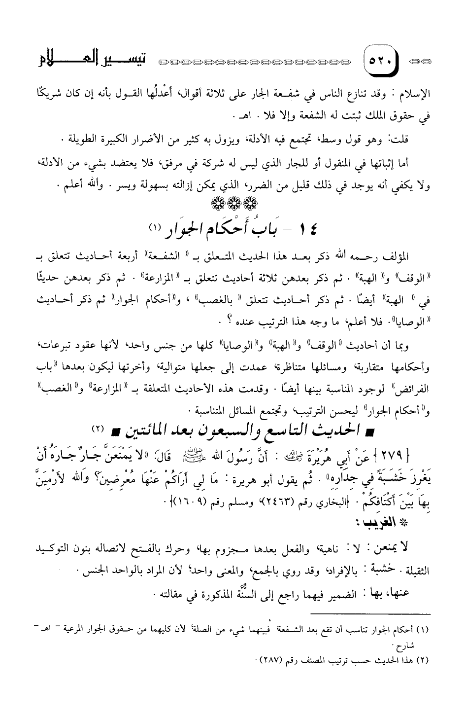 (¬1) أحكام الجوار تناسب أن تقع بعد الشفعة، فبينهما شيء من الصلة، لأن كليهما من حقوق الجوار المرعية ا. هـ شارح