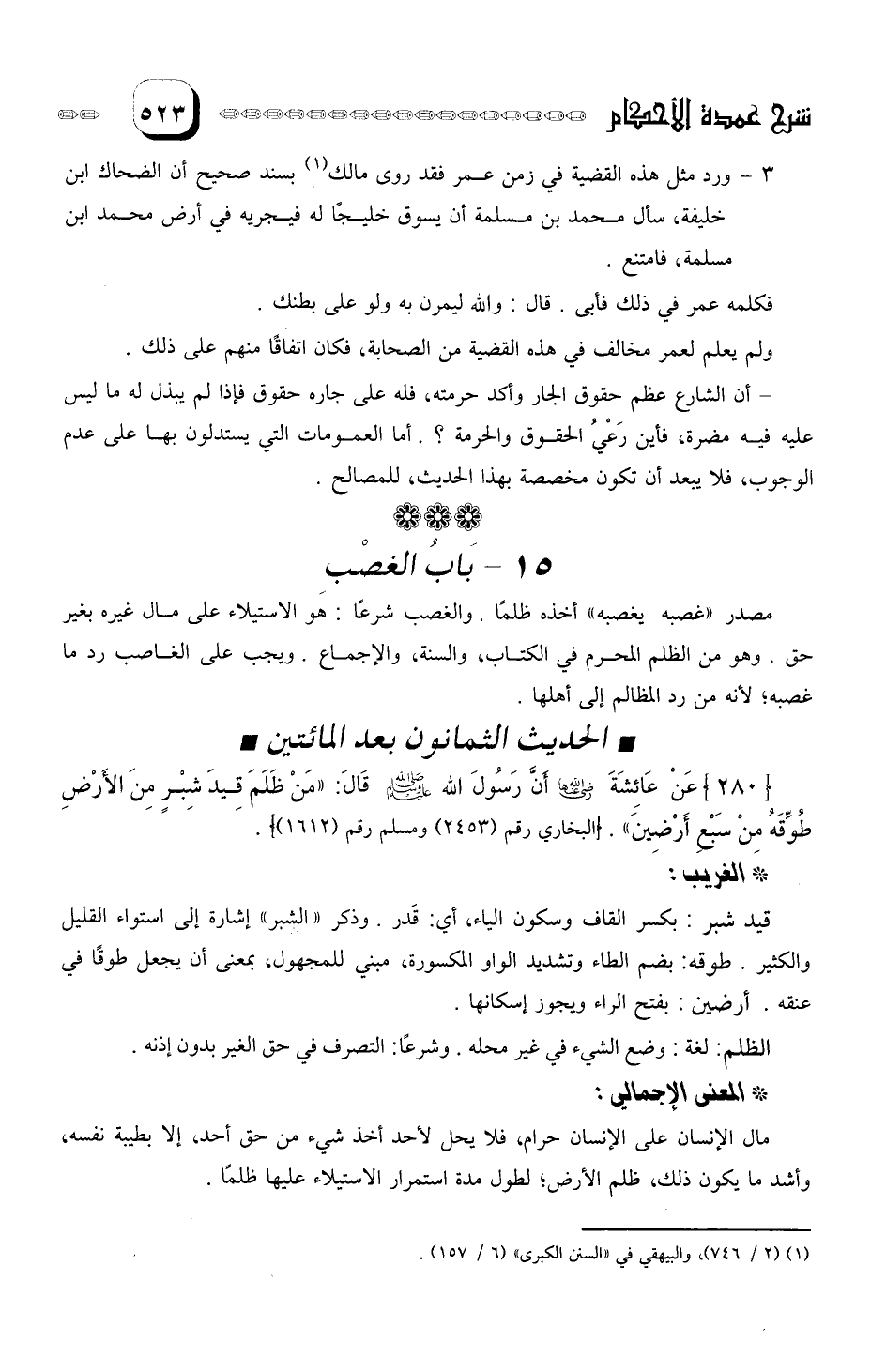 3- ورد مثل هذه القضية في زمن عمر فقد روى مالك بسند صحيح أن الضحاك بن خليفة، سأله محمد بن مسلمة أن يسوق خليجا له فيجريه في أرض محمد بن مسلمة، فامتنع.