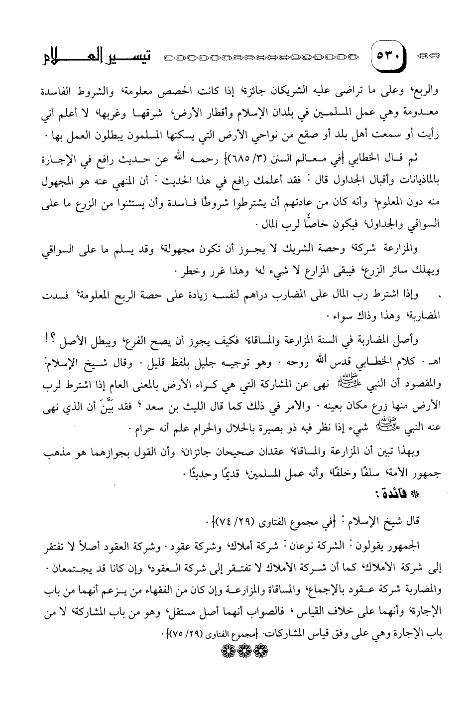 وأصل المضاربة في السنة المزارعة والمساقاة، فكيف يجوز أن يصح الفرع، ويبطل الأصل؟! ا. هـ. كلام الخطابي قدس الله روحه. وهو توجيه جليل، بلفظ قليل. وقال شيخ الإسلام والمقصود أن النبي صلى الله عليه وسلم نهى عن المشاركة التي هي كراء الأرض بالمعنى العام إذا اشترط لرب الأرض منها زرع مكان بعينه. والأمر في ذلك كما قال الليث بن سعد؛ فقد بين أن الذي نهى عنه النبي صلى الله عليه وسلم شيء إذا نظر فيه ذو بصيرة بالحلال والحرام علم أنه حرام.