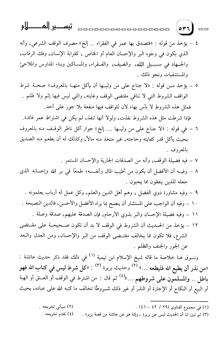 12- يؤخذ من الحديث أن الشروط في الوقف لابد أن تكون صحيحة على مقتضى الشرع؛ فلا تكون مما يخالف مقتضى الوقف من البر والإحسان، ومن العدل والبعد عن الجور والجنف والظلم.