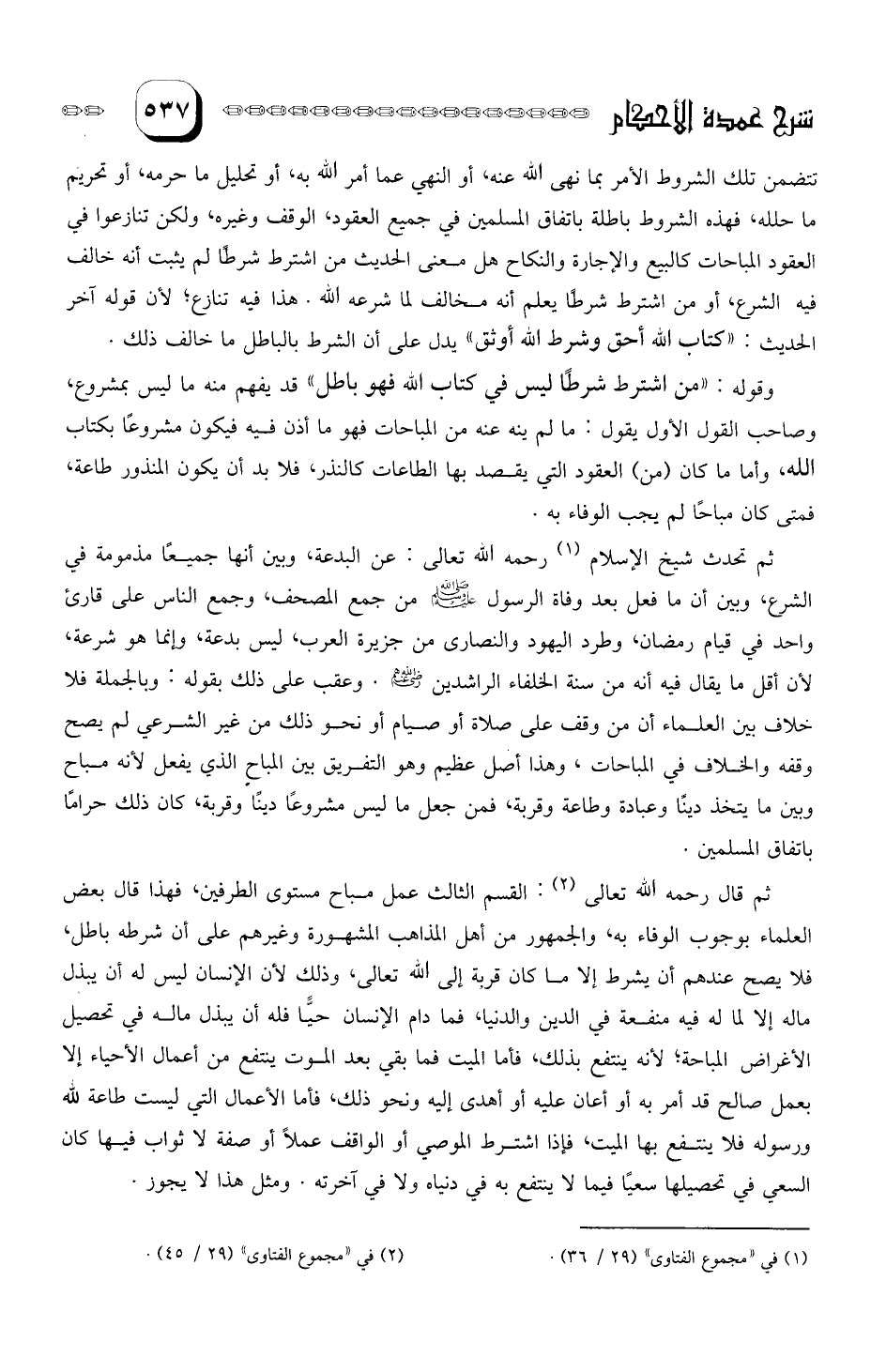 ثم قال رحمه الله تعالى: القسم الثالث عمل مباح مستوى الطرفين فهذا قال بعض العلماء بوجوب الوفاء به، والجمهور من أهل المذاهب المشهورة وغيرهم على أن شرطه باطل، فلا يصح عندهم أن يشرط إلا ما كان قربة إلى الله تعالى، وذلك لأن الإنسان ليس له أن يبذل ماله إلا لما له فيه منفعة في الدين والدنيا، فما دام الإنسان حياً فله أن يبذل ماله في تحصيل الأغراض المباحة، - لأنه ينتفع بذلك، فأما الميت فما بقي بعد الموت ينتفع من أعمال الأحياء إلا بعمل صالح قد أمر به أو أعان عليه أو أهدى إليه ونحو ذلك، فأما الأعمال التي ليست طاعة لله ورسوله فلا ينتفع بها الميت فإذا اشترط الموصي أو الواقف عملا أو صفة لا ثواب فيها كان السعي في تحصيلها سعياً فيما لا ينتفع به في دنياه ولا في آخرته، ومثل هذا لا يجوز.