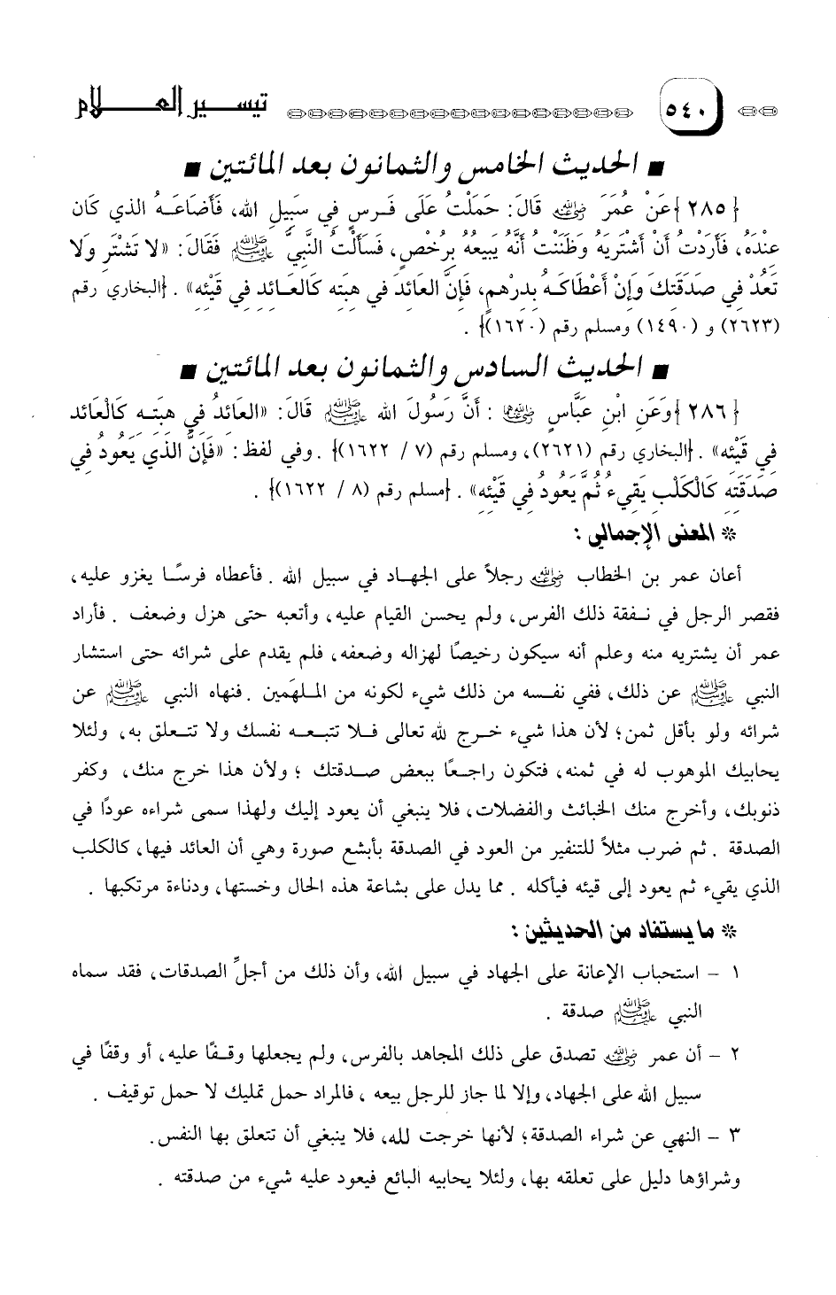 عَنْ عُمَرَ رَضي الله عَنْهُ قَالَ: حَمَلْت عَلَى فَرس فِي سَبيلِ الله، فَأضَاعَهُ الذي كان عِنْدَهُ، فَأرَدْتُ أن أشْتَريَهُ وَظَنَنتُ أنَهُ يَبيعُهُ بِرُخْص، فَسألتُ النَبي صلى الله عليه وسلم فقال: "لا تَشترِهِ ولا تَعُدْ في صَدَقَتِكَ وَإن أعْطَاكَهُ بِدِرْهَمٍ، فَإنَ العَائِدَ في هِبَتِهِ كالعَائِدِ فِي قيئهِ ".
