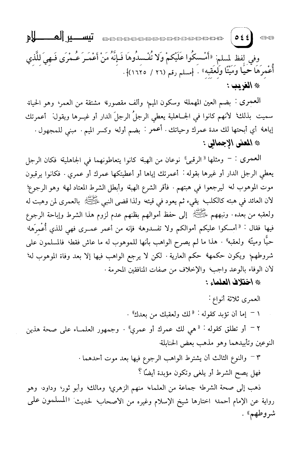 في لفظ لمسلمِ: " امسِكُوا عَلَيْكُمْ أموَالَكمْ وَلا تُفْسِدُوهَا فَإنَّهُ مَنْ أعْمَرَ عُمْرَى فهِي لِلَّذِي اعْمِرَهَا حَيّاً وَمَيْتاً وَلِعَقِبِهِ ".