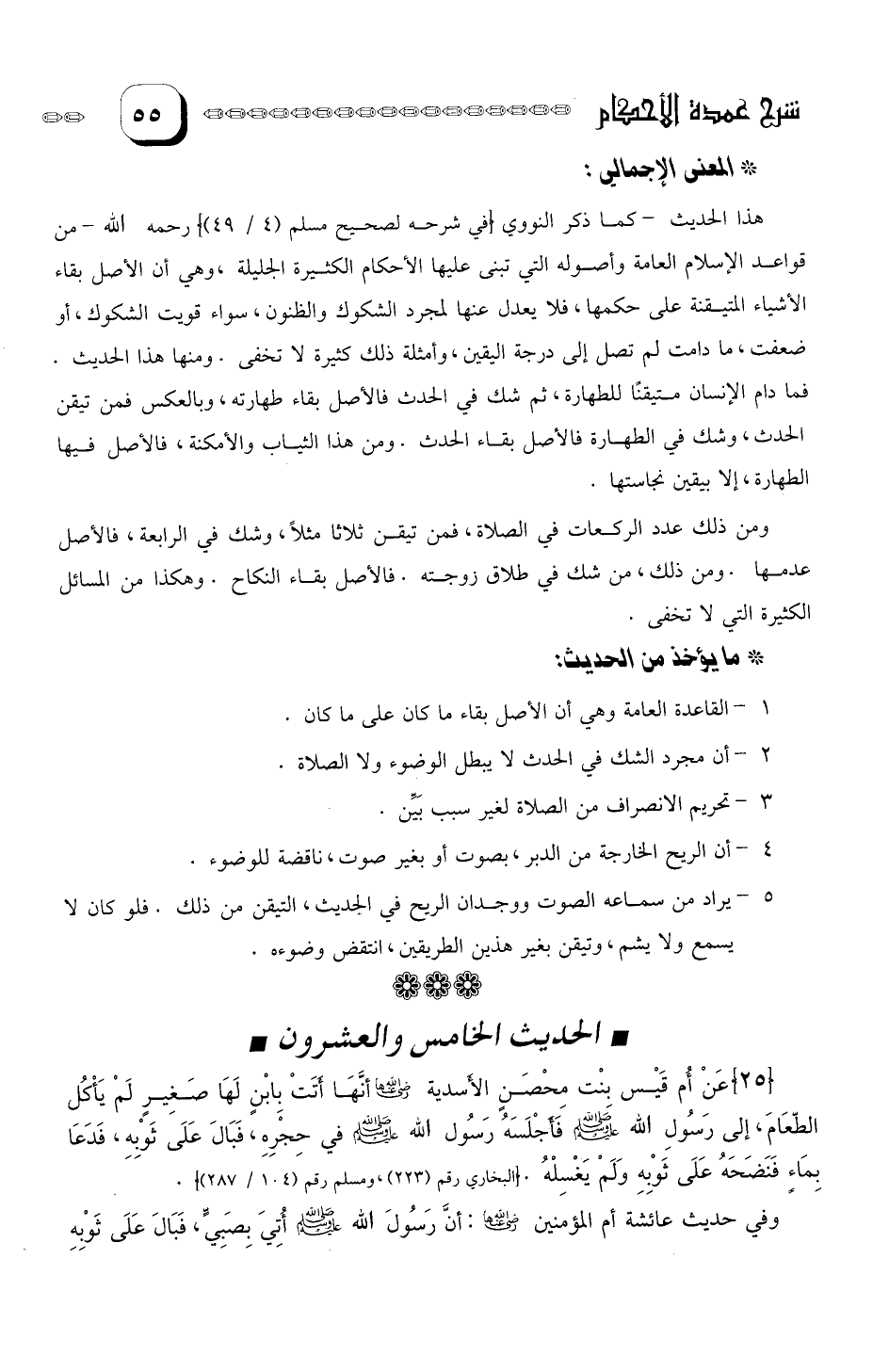 وهى أن الأصل بقاء الأشياء المتيقنة على حكمها، فلا يعدل عنها لمجرد الشكوك والظنون، سواء قويت الشكوك، أو ضعفت، مادامت لم تصل إلى درجة اليقين، وأمثلة ذلك كثيرة لا تخفى. ومنها هذا الحديث.