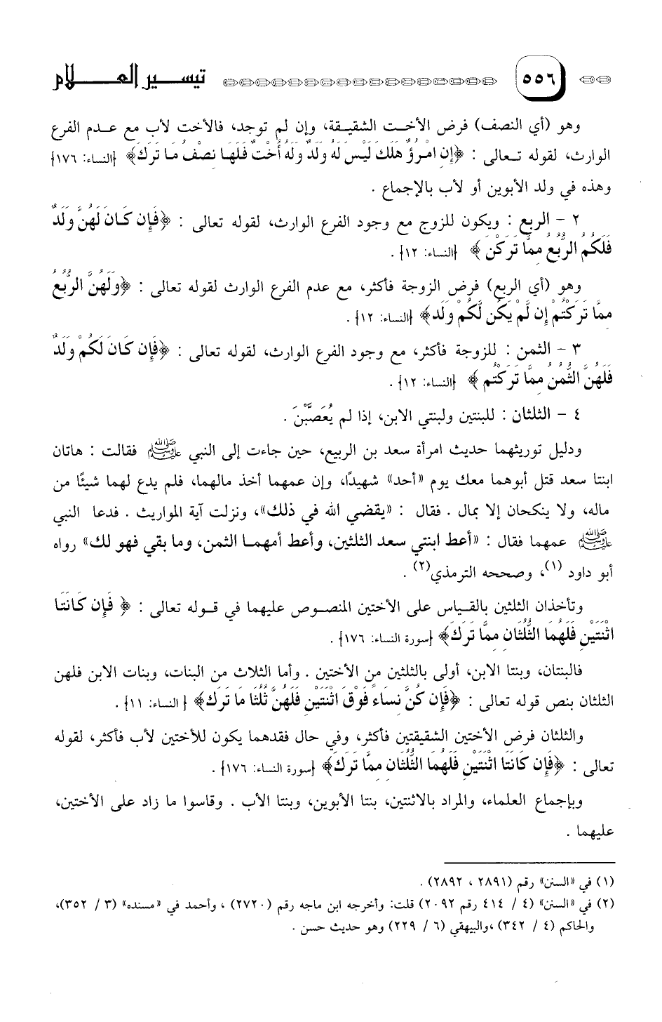 ودليل توريثهما الثلثين، حديث امرأة سعد بن الربيع، حين جاءت إلى النبي صلى الله عليه وسلم فقالت: هاتان ابنتا سعد قتل أبوهما معك يوم (أحد) شهيدا، وإن عمهما أخذ مالهما، فلم يدع لهما شيئا من ماله، ولا ينكحان إلا بمال. فقال: يقضى الله في ذلك، ونزلت آية المواريث.