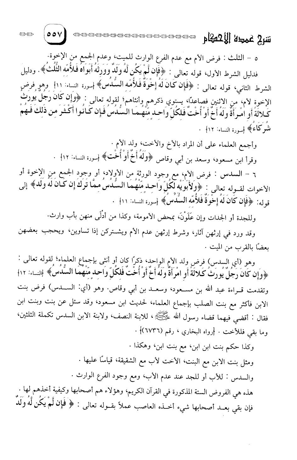 وهو (أي السدس) فرض ولد الأم الواحد، ذكرا كان أو أنثى بإجماع العلماء لقوله تعالى: {وإن كان رجل يورث كلالة أو امرأة وله أخ أو أخت فلكل واحد منها السدس} وتقدمت قراءة عبد الله بن مسعود، وسعد بن أبي وقاص.