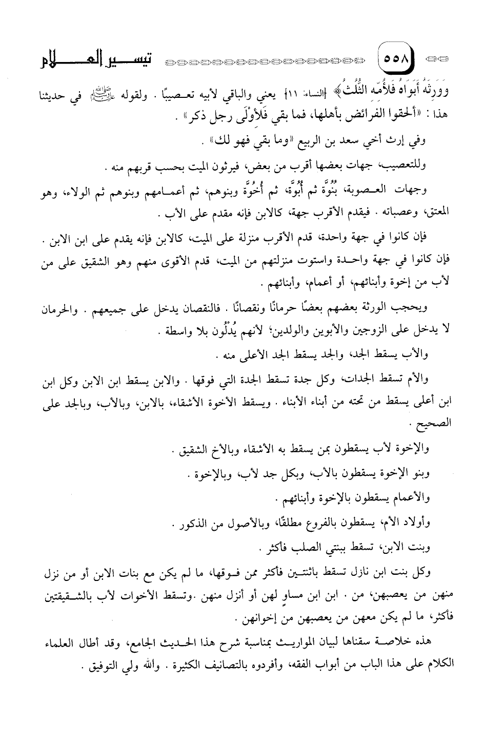 هذه خلاصة سقناها لبيان المواريث بمناسبة شرح هذا الحديث الجامع، وقد أطال العلماء الكلام على هذا الباب من أبواب الفقه, وأفردوه بالتصانيف الكثيرة. والله ولي التوفيق.