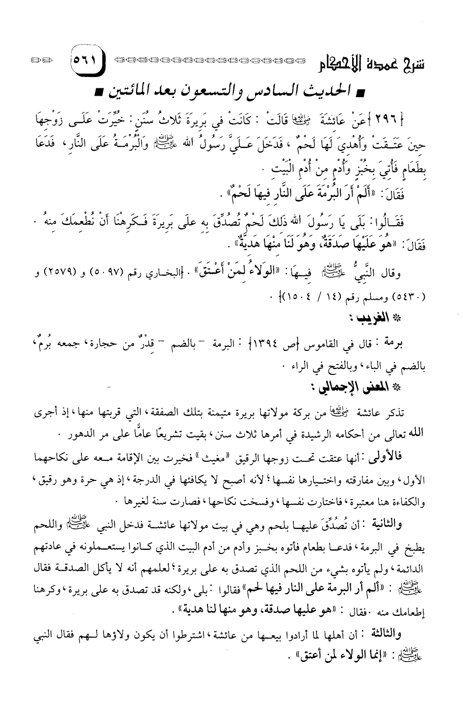 والثانية: أنه تُصدقَ عليها بلحم وهي في بيت مولاتها عائشة فدخل النبي صلى الله عليه وسلم واللحم يطبخ في البرمة، فدعا بطعام فأتوه بخبز وأدم من أدم البيت الذي كانوا يستعملونه في عادتهم الدائمة، ولم يأتوه بشيء من اللحم الذي تصدق به على بريرة، لعلمهم أنه لا يأكل الصدقة فقال: ألم أر البرمة على النار فيها لحم، فقالوا: بلى، ولكنه قد تصدق به على بريرة، وكرهنا إطعامك منه.