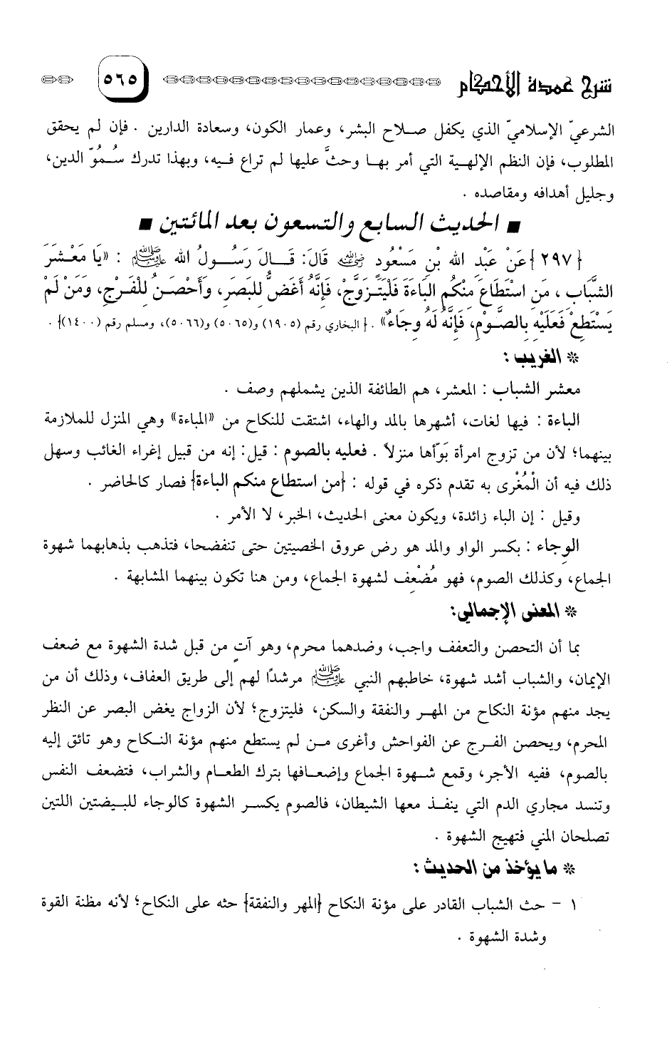 1- حث الشباب القادر على مؤنة النكاح [المهر والنفقة] حثه على النكاح لأنه مظنة القوة وشدة الشهوة.