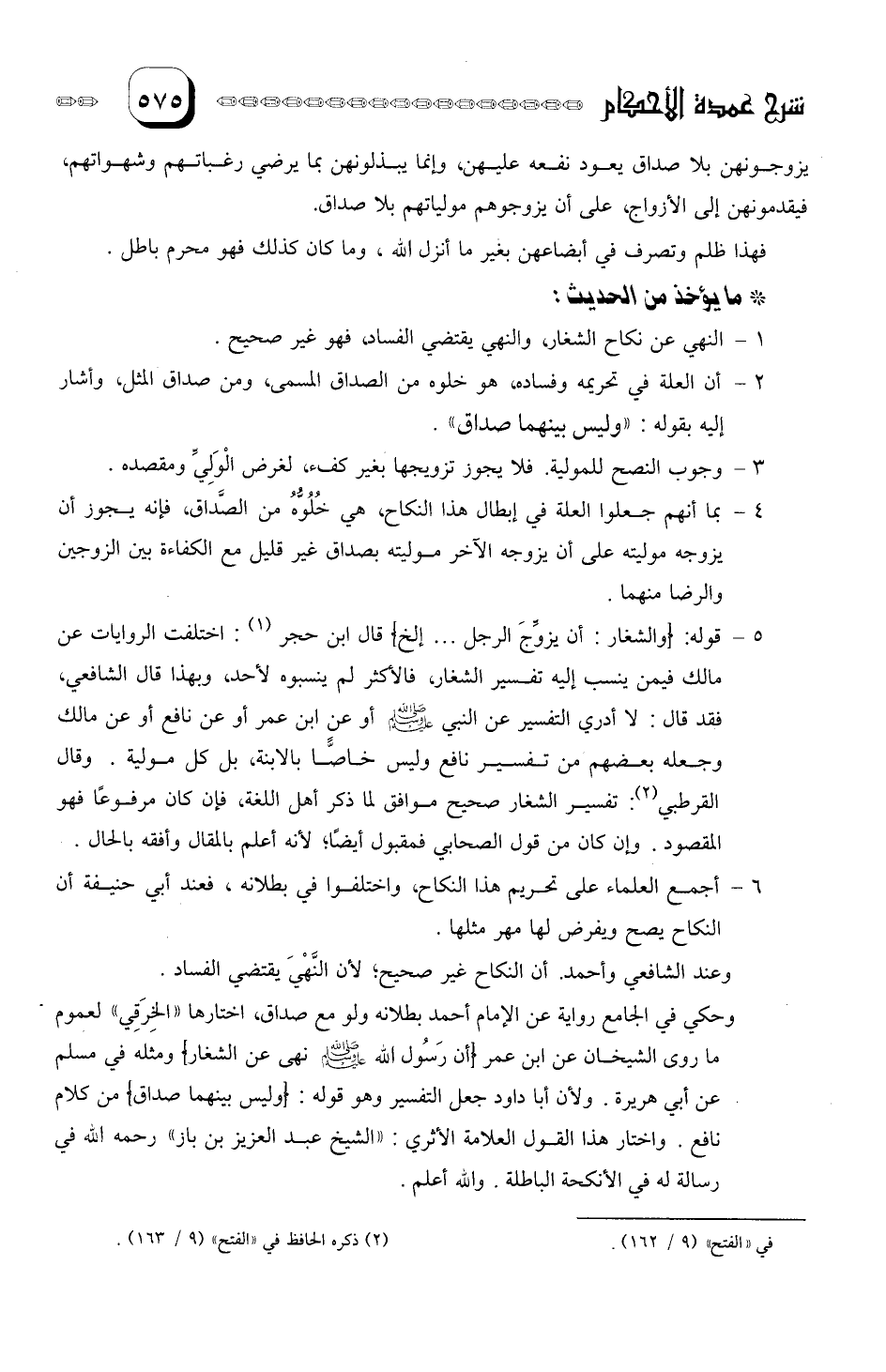 5- قوله: [والشغار: أن يزوج الرجل.. إلخ] قال ابن حجر: اختلفت الروايات عن مالك فيمن ينسب إليه تفسير الشغار، فالأكثر لم ينسبوه لأحد، وبهذا قال الشافعي، فقد قال: لا أدرى التفسير عن النبي صلى الله عليه وسلم أو عن ابن عمر أو عن نافع أو عن مالك وجعله بعضهم من تفسير نافع وليس خاصا بالابنة، بل كل مولية. وقال القرطبي: تفسير الشغار صحيح موافق لما ذكر أهل اللغة، فإن كان مرفوعا فهو المقصود. وإن كان من قول الصحابي فمقبول أيضا لأنه أعلم بالمقال وأفقه بالحال.