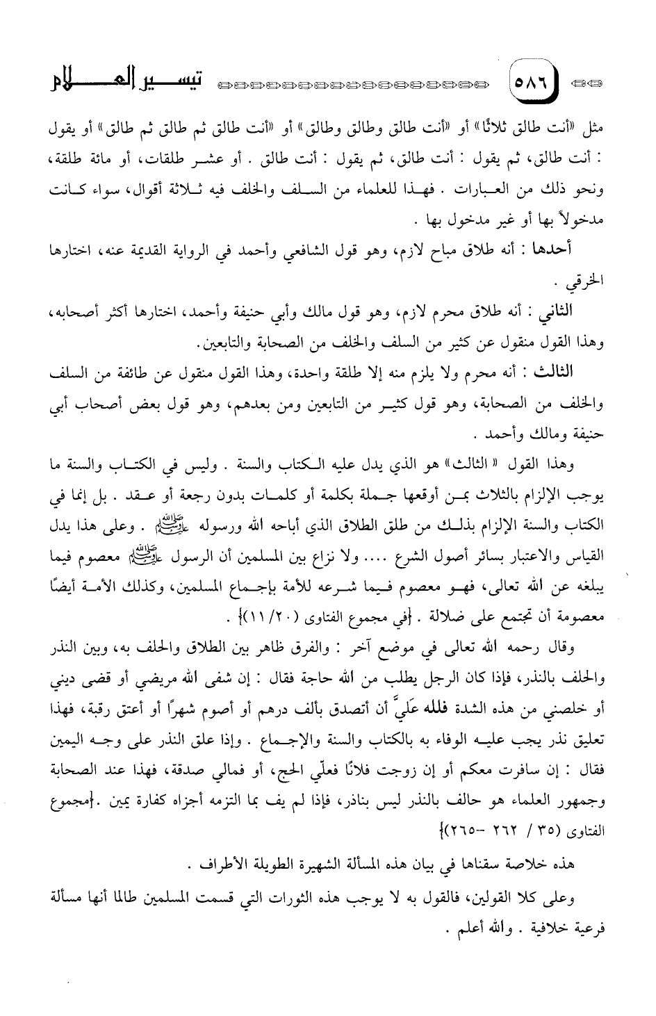 وهذا القول (الثالث) هو الذي يدل عليه الكتاب والسنة. وليس في الكتاب والسنة مايو جب الإلزام بالثلاث بمن أوقعها جملة بكلمة أو كلمات بدون رجعة أو عقد. بل إنما في الكتاب والسنة الإلزام بذلك من طلق الطلاق الذي أباحه الله ورسوله. وعلى هذا يدل القياس والاعتبار بسائر أصول الشرع ... (و) لا نزاع بين المسلمين أن الرسول صلى الله عليه وسلم معصوم فيما يبلغه عن الله تعالى، فهو معصوم فيما شرعه للأمة بإجماع المسلمين، وكذلك الأمة أيضا معصومة أن تجتمع على ضلالة.