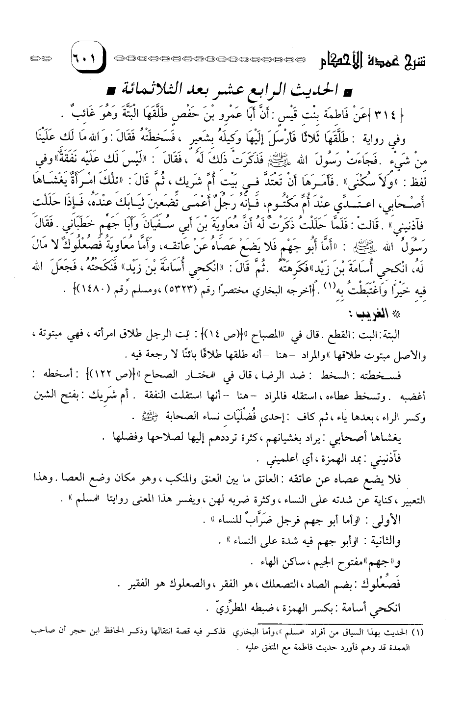 (¬1) الحديث بهذا السياق من أفراد (مسلم) وأما البخاري، فذكر فيه قصة نتقالها وذكر بن حجر أن صاحب العمدة قد وهم فأورد حديث فاطمة مع المتفق عليه.