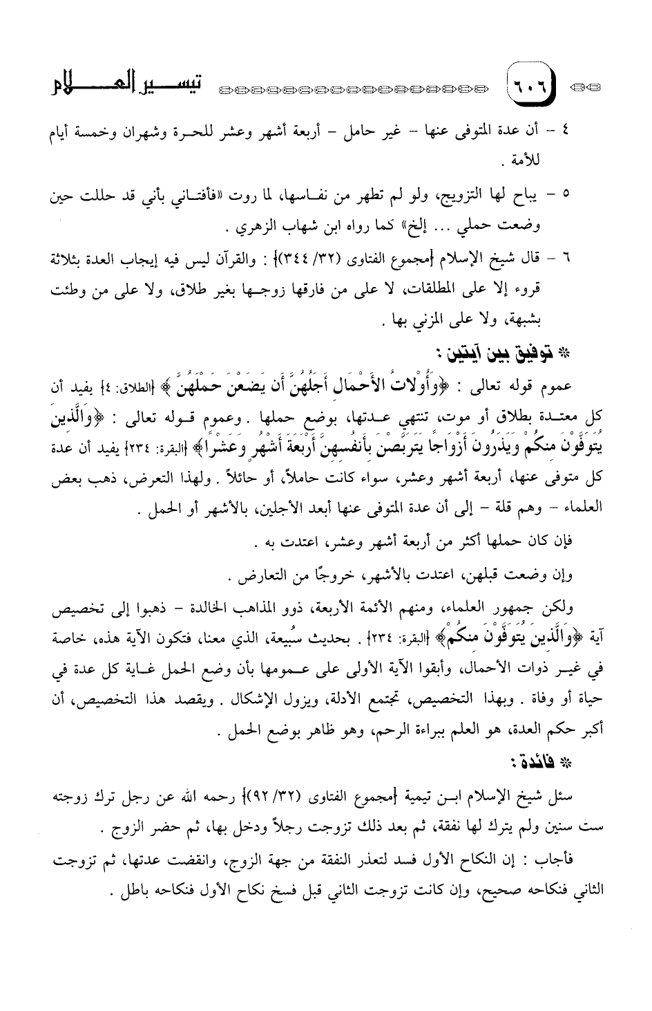 ولكن جمهور العلماء، ومنهم الأئِمة الأربعة، ذوو المذاهب الخالدة- ذهبوا إلى تخصيص آية {والَّذِينَ يُتَوَفْوْنَ منكم} الآية. بحديث سُبَيْعة، الذي معنا، فتكون الآية هذه، خاصة في غير ذوات الأحمال، وأبقوا الآية الأولى على عمومها بأن وضع الحمل غاية كل عدة في حياة أو وفاة.