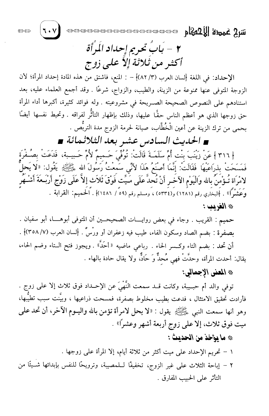 عَنْ زَينبَ بِنْتِ أم سَلمَةَ قَالَت: تُوُفي حَمِيمٌ لأم حَبيبة، فدَعَتْ بِصُفرَةٍ فمسحَتْ بِذِراعَيْهَا فَقَالَتْ: إنَّما أصْنَعُ هذَا لأنِّي سمِعْتُ رسُول الله صلى الله عليه وسلم يقول: "لا يَحِلُّ لامْرَأةٍ تُؤمِن بالله واليَوم الآخِر أن تُحِدَّ عَلَى مَيِّتٍ فَوْق ثَلاثٍ إلا عَلَى زوْج أربَعَةَ أشْهُر وَعَشْرا"