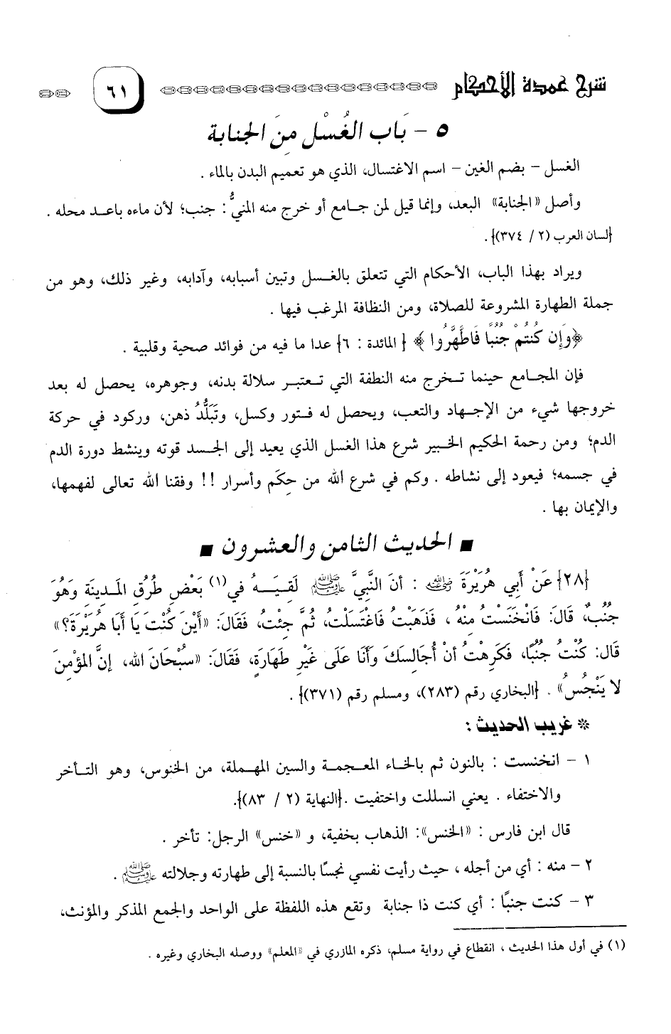 عَنْ أبي هُرَيْرَةَ رَضيَ الله عَنْهُ: أن النبي صلى الله عليه وسلم لقيه في (¬1) بعض طرق المدينة وهُوَ جُنُبٌ، قالَ: فَاْنخَنَسْتُ مِنْهُ. فَذَهبْتُ- فاغتسلت، ثمً جِئت، فقال: " أيْنَ كُنْتَ يَا أبا هريرة؟ " قال: كُنْتُ جُنُباً، فَكَرِهتُ أنْ أجالسك وَأنَا عَلَى غَيْرِ طَهَاَرةٍ. فقَالَ: " سُبْحَانَ الله إِنَّ الْمُؤْمِنَ لا يَنْجُسُ ".