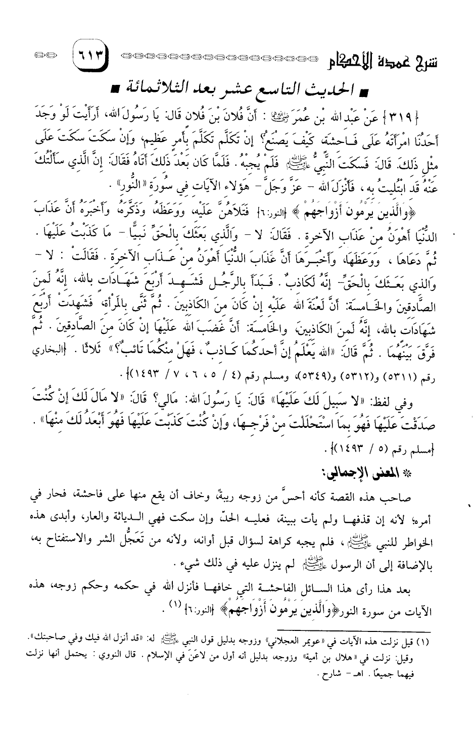 عَنْ عَبْدِ الله بن عُمَرَ رَضيَ الله عَنهُمَا: أنَّ فلانَ بنَ فُلانٍ قَال: يا رسول الله، أرأيت لَو وَجَدَ أحدنا امْرَأتَهُ عَلَى فَاحِشَةٍ، كَيفَ يَصْنَعُ؟ إن تَكَلَّم، تَكَلَّم بِأمْر عَظِيمٍ، وَإنْ سَكَتَ سَكَتَ عَلَى مِثْل ذلِكَ؟