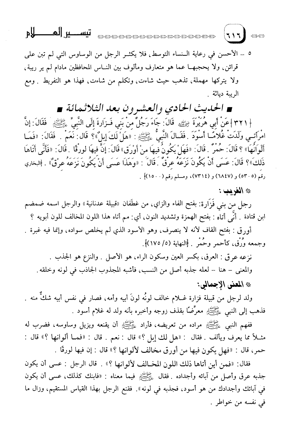 فقال: هل لك إبل؟ قال: نعم. قال: فما ألوانها؟ قال: حمر، قال: فهل يكون فيها من أورق مخالف لألوانها؟ قال: إن فيها لورقا.