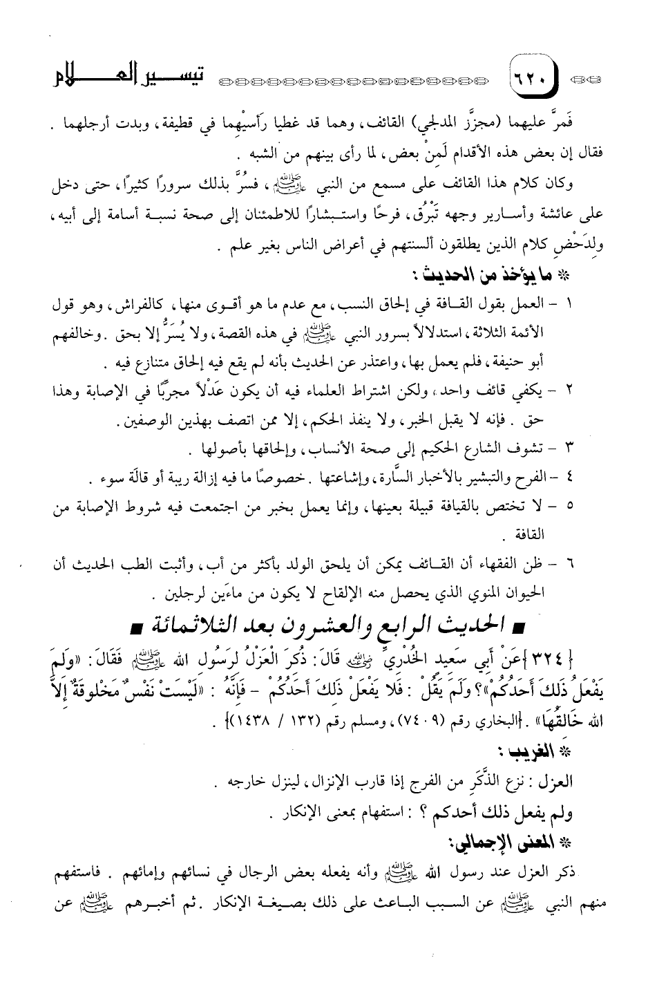 1- العمل بقول القافة في إلحاق النسب، مع عدم ما هو أقوى منها، كالفراش، وهو قول الأئمة الثلاثة، استدلالا بسرور النبي صلى الله عليه وسلم في هذه القصة، ولا يسر إلا بحق.