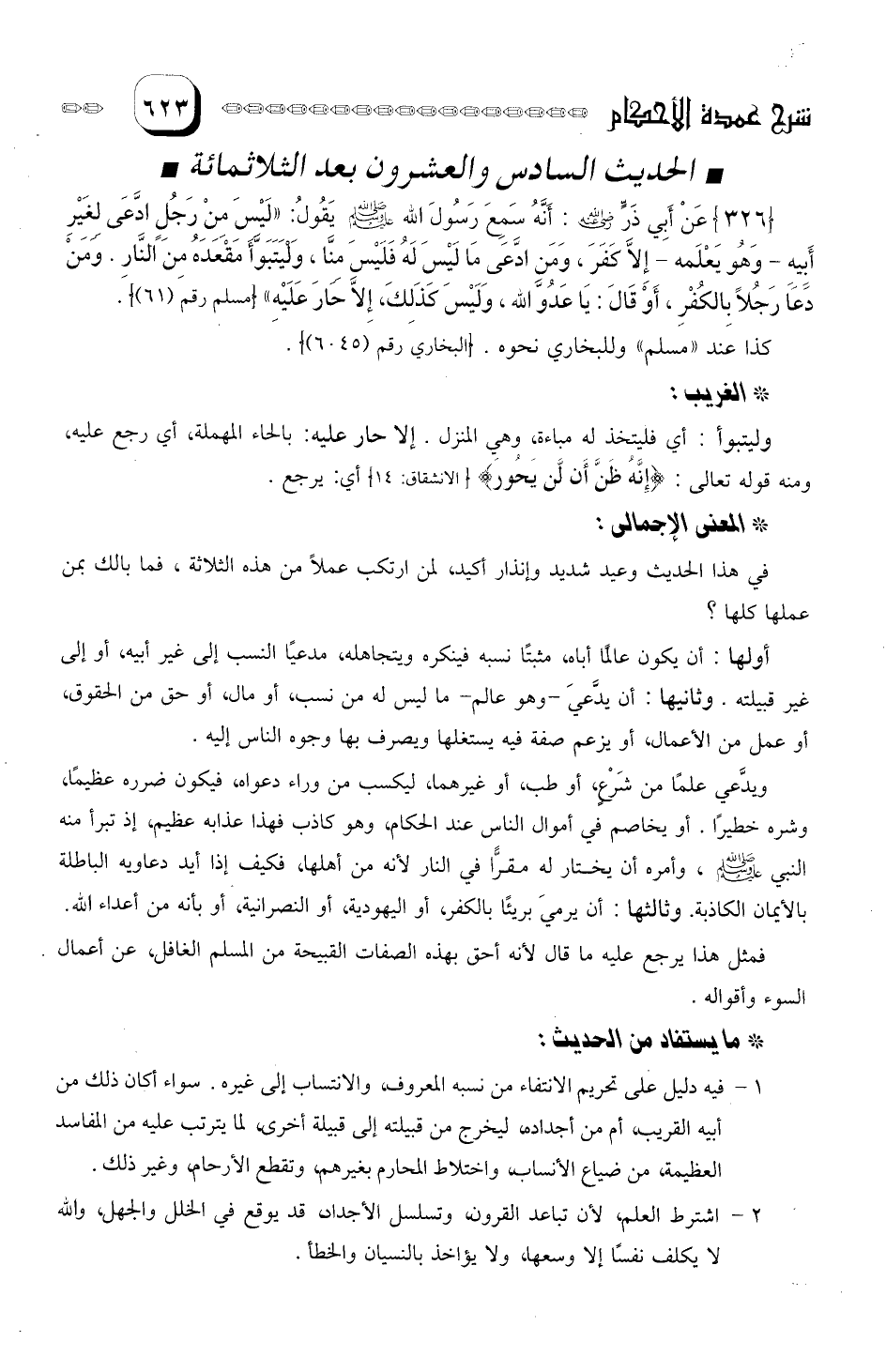 1- فيه دليل على تحريم الانتفاء من نسبه المعروف، والانتساب إلى غيره. سواء أكان ذلك من أبيه القريب، أم من أجداده، ليخرج من قبيلته إلى قبيلة أخرى. لما يترتب عليه من المفاسد العظيمة، من ضياع الأنساب، واختلاط المحارم بغيرهم، وتقطع الأرحام، وغير ذلك.