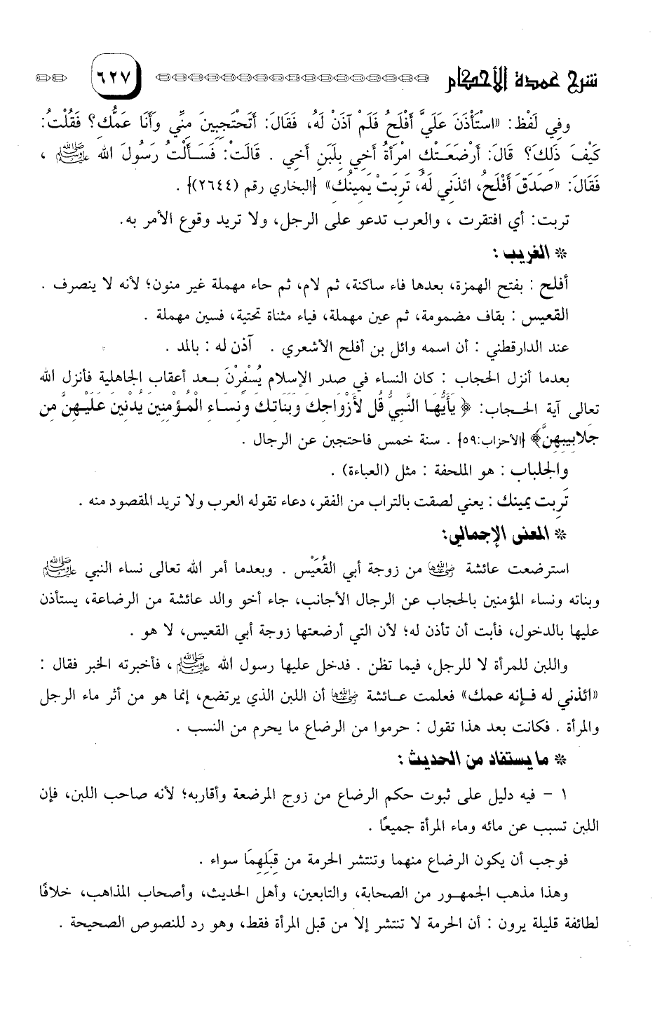 في لفظ: ثم اِستأذَنَ عَلَيَّ أفلَحُ فَلَمْ آذَنْ لَهُ، فَقَالَ: أَتَحْتَجِبِين مِنِّي وَأَنَا عَمُّكِ؟