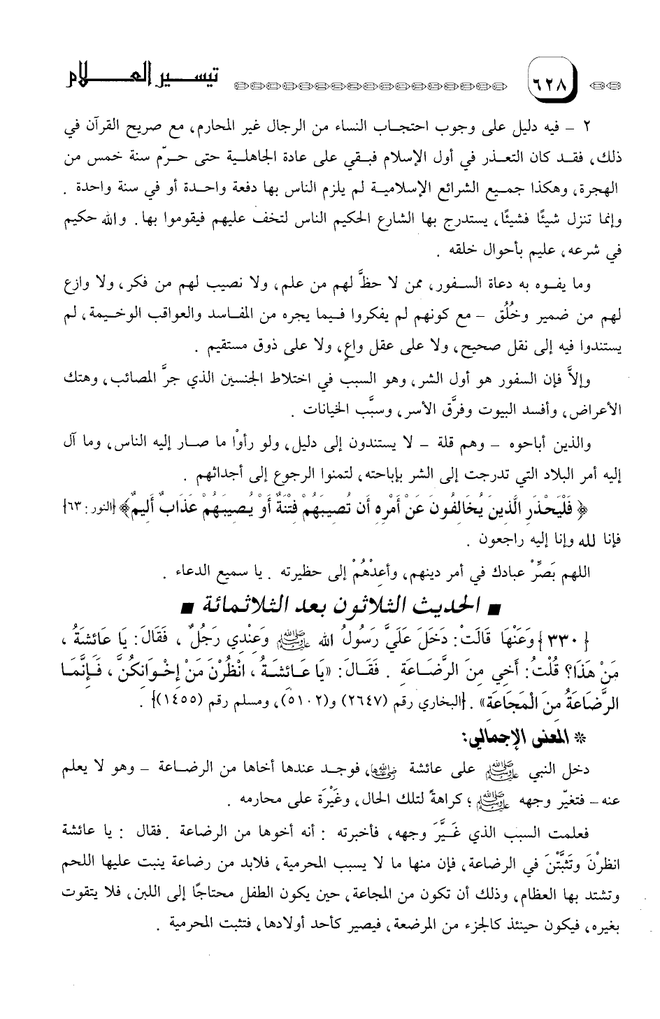 2- فيه دليل على وجوب احتجاب النساء من الرجال غير المحارم، مع صريح القرآن في ذلك، فقد كان التعذر في أول الإسلام فبقى على عادة الجاهلية حتى حرم سنة خمس من الهجرة وهكذا جميع الشرائع الإسلامية لم يلزم الناس بها دفعة واحدة، أو في سنة واحدة. وإنما تنزل شيئاً فشيئا، يستدرج بها الشارع الحكيم الناس لتخف عليهم فيقوموا بها. والله حكيم في شرعه، عليم بأحوال خلقه.