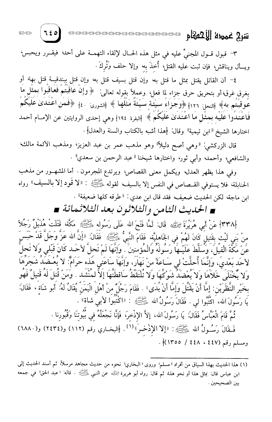 عَنْ أبي هريرة رضي اللَه عَنْهُ قالَ: لَمَّا فَتَحَ الله عَلَى رَسُولِهِ صلى الله عليه وسلم مَكَّةَ، قَتَلَتْ هُذَيْل رَجلا مِنْ بَني لَيْثٍ بِقتِيل كَان لَهُمْ فِي الْجَاهِلِيَّةِ، فَقَامَ النبي صلى الله عليه وسلم فَقَالَ: " إنَّ الله عَزَّ وَجَل قَدْ حَبَسَ عَنْ مكَّةَ الفِيلَ، وَسلَّطَ عَلَيْهَا رَسُولَهُ وَالْمُؤمِنِينِ. وَإنَّهَا لَمْ تَحِلَّ لأحَدٍ كَانَ قبلي وَلا تَحِلُّ لأحَدٍ بَعدِي، وَإنَمَا أحلّت لي سَاعَة مِن النَّهار، وَإنَّهَا ساعتي هذِهِ حَرَام: لا يُعضَدُ شَجَرُهَا وَلا يختلى خَلاهَا ولا يُعْضَدُ شَوْكهَا وَلا تُلْتَقَط ساقِطتهَا إلا لِمُنْشِدٍ. وَمَنْ قُتِلَ لَهُ قَتيل فهو بخير النَّظَرَين: إما أن يَقتُل وإمَّا إن يُدَى ".