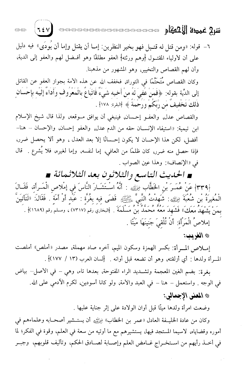 عَن عُمَرَ بنِ الَخطَّاب رَضِيَ الله عَنْهُ: أنَّهُ اسْتشارَ النَّاسَ فِي إمْلاصِ الْمَرأةِ، فَقَالَ الْمُغِيرَةُ بنُ شُعبةَ رَضِيَ الله عَنْهْ: شَهِدْتُ النًبي صلى الله عليه وسلم قَضىَ فِيهِ بِغُرَّة: عَبْدٍ أو أمَةٍ.