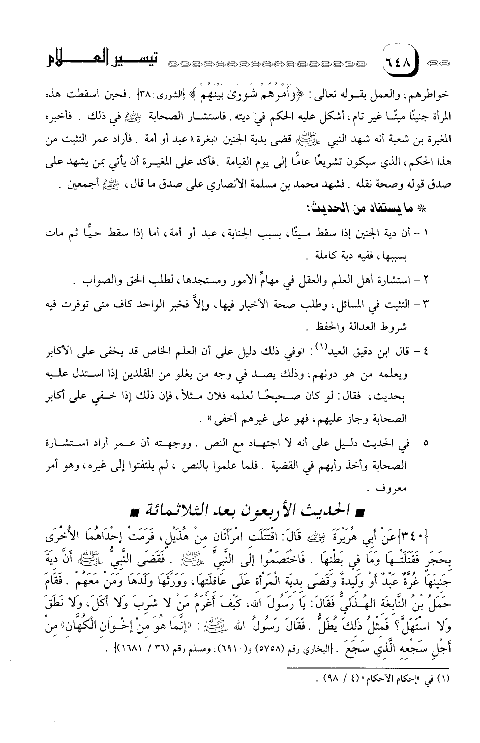 4- قال (ابن دقيق العيد) : [وفى ذلك دليل على أن العلم الخاص قد يخفى على الأكابر ويعلمه من هو دونهم، وذلك يصد في وجه من يغلو من المقلدين إذا استدل عليه بحديث، فقال: لو كان صحيحا لعلمه فلان مثلا، فإن ذلك إذا خفي على أكابر الصحابة وجاز عليهم، فهو على غيرهم أخفى] .
