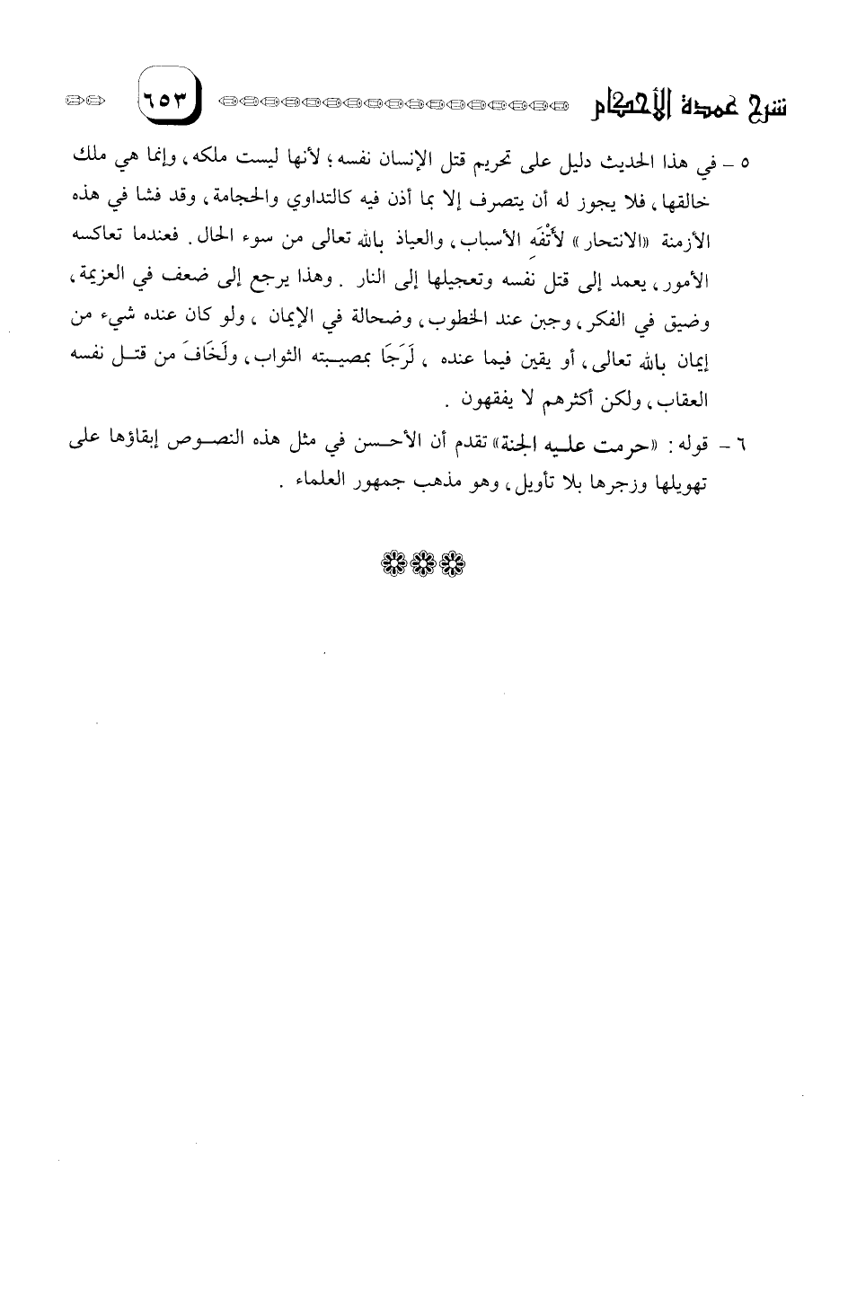 5- في هذا الحديث دليل على تحريم قتل الإنسان نفسه. لأنها ليست ملكه وإنما هي ملك خالقها، فلا يجوز له أن يتصرف إلا بما أذن فيه كالتداوي والحجامة.