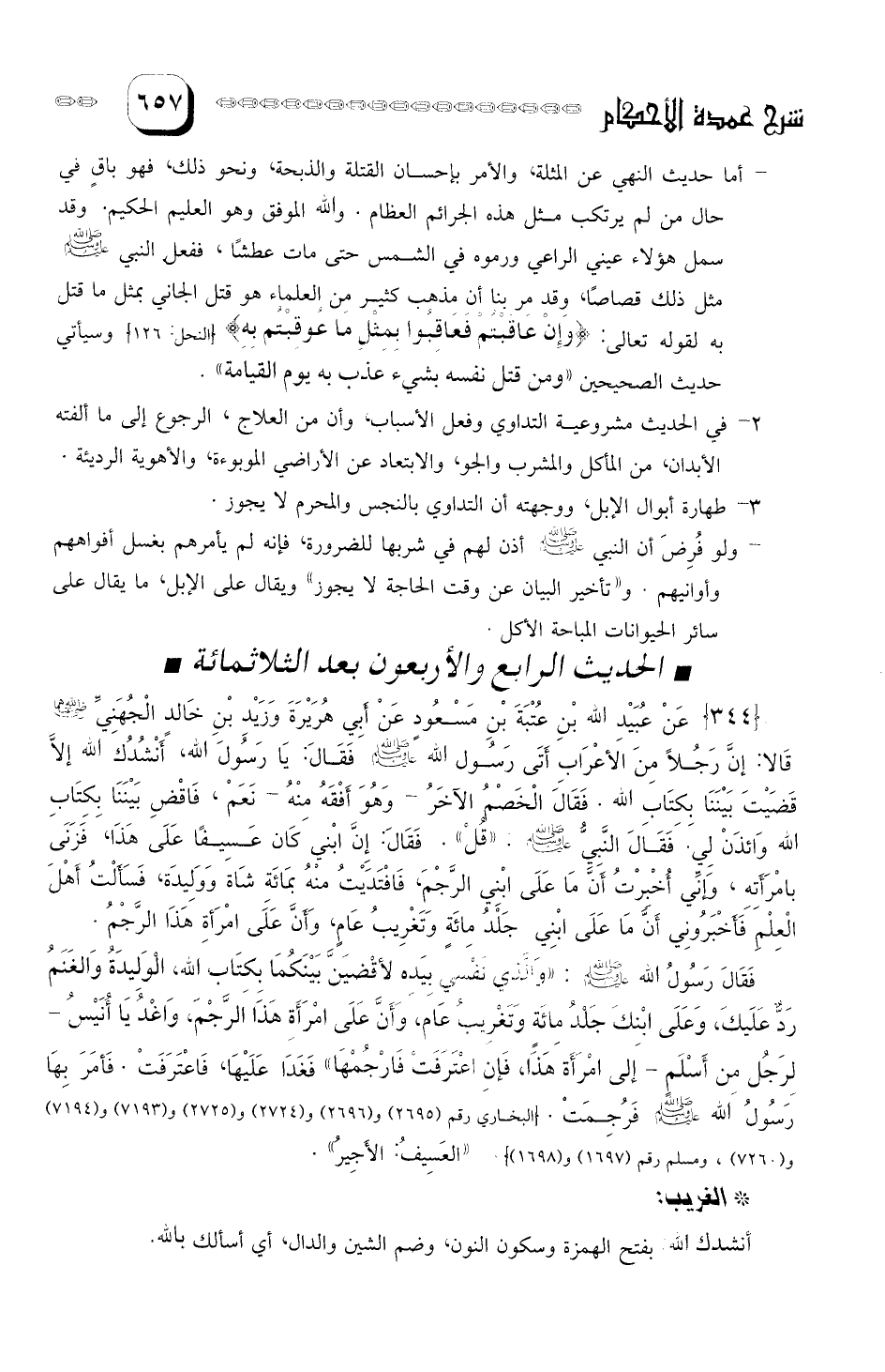 عن عُبَيْد الله بن عُتْبَةَ بن مَسْعُود عَنْ أبي هريرة وَزَيد بنِ خَالِد الْجهَني رَضي الله عَنْهُمَا: أنَّهُمَا قالا: إنَّ رجلا مِن الأعراب أتَى رسولَ الله صلى الله عليه وسلم فقَالَ: يا رسول الله، أنْشُدُكَ الله إلا قَضَيْتَ بَيْنَنا بكتاب الله.