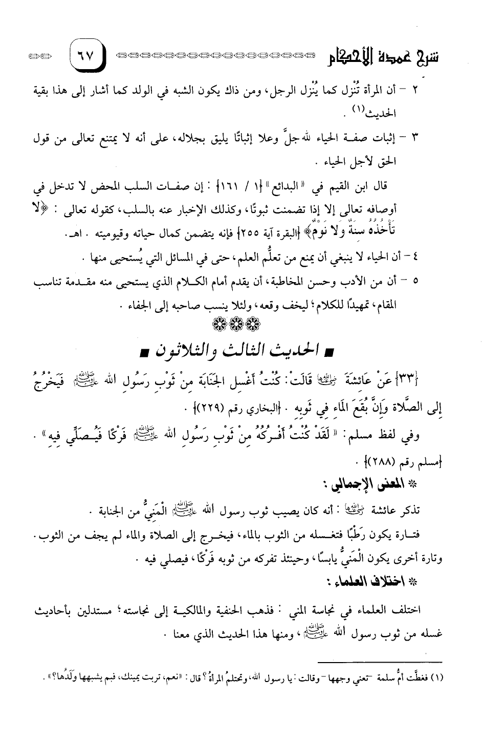 عن عَائِشَة قَالَتْ: كنتُ أغْسِل الْجَنَابةَ مَنْ ثَوبِ رَسولِ الله صلى الله عليه وسلم فيخرج إلى الصلاةِ وإن بُقَعَ الْمَاءِ في ثَوْبِهِ. وفِي لفظ مسلم "لقد كُنْتُ أفرُكهُ مِن ثَوْبِ رَسولَ الله صلى الله عليه وسلم فَركاً فيصَلي فِيهِ ".