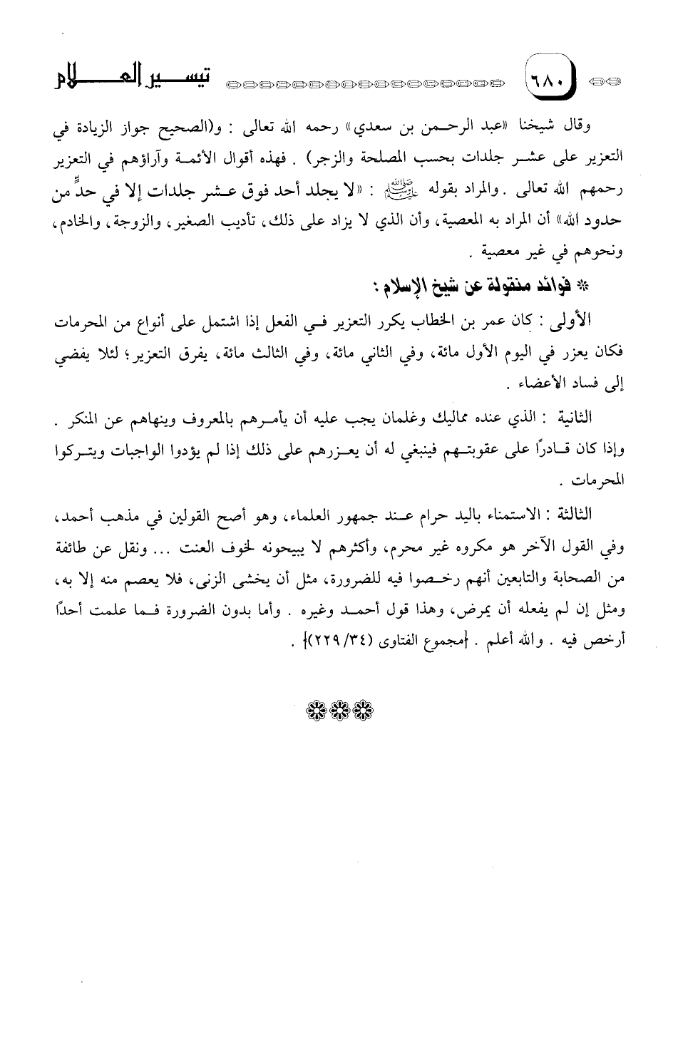 وقال شيخنا (عبد الرحمن بن سعدى) رحمه الله تعالى: و (الصحيح جواز الزيادة في التعزير على عشر جلدات بحسب المصلحة والزجر) . فهذه أقوال الأئمة وآراؤهم في التعزير رحمهم الله تعالى.
