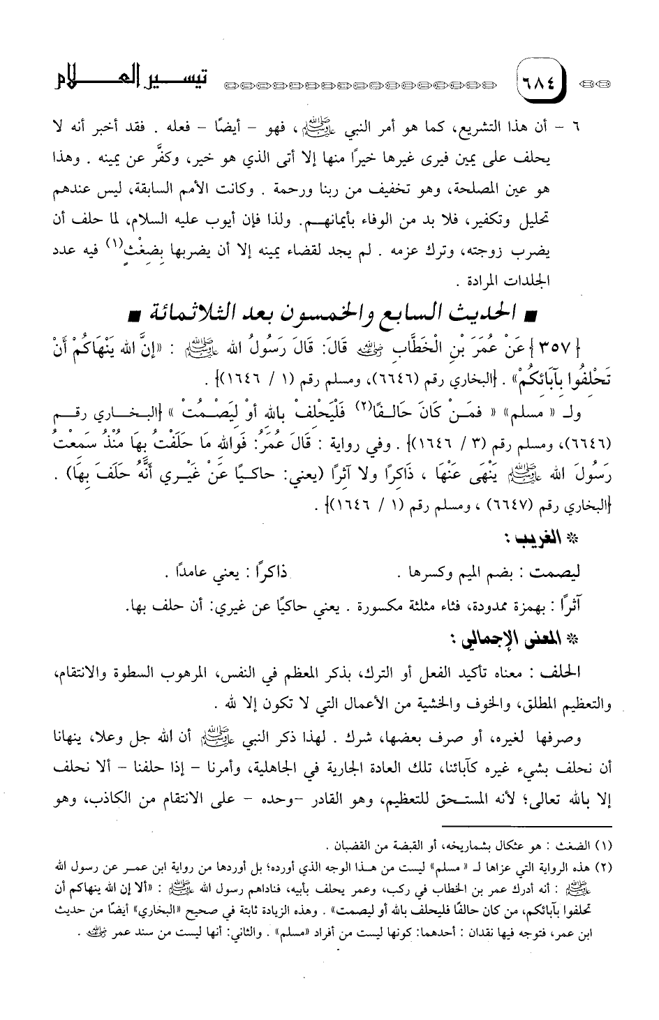(¬2) هذه الرواية التي عزاها لـ (مسلم) ليست من هذا الوجه الذي أورده بل أوردها من رواية ابن عمر عن رسول الله صلى الله عليه وسلم: أنه أدرك عمر بن الخطاب في ركب، وعمر يحلف بأبيه، فناداهم رسول الله صلى الله عليه وسلم: ألا إن الله ينهاكم أن تحلفوا بآبائكم، من كان حالفاً، فليحلف بالله أو ليصمت.