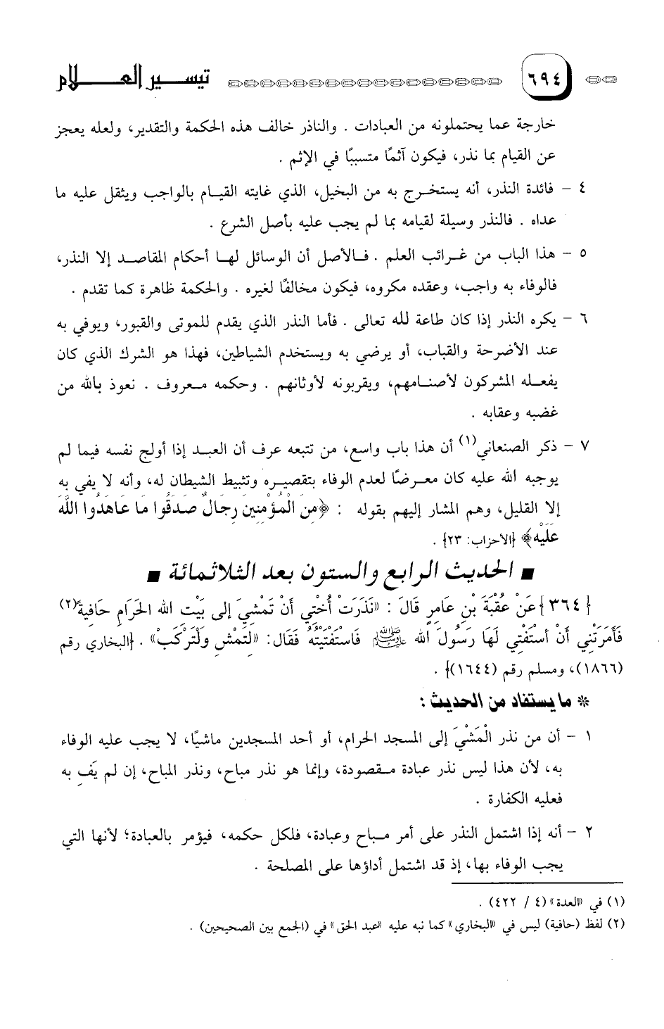 7- ذكر الصنعاني أن هذا باب واسع، من تتبعه عرف أن العبد إذا أولج نفسه فيما لم يوجبه الله عليه كان معرضا لعدم الوفاء بتقصيره وتثبيط الشيطان له، وأنه لا يفي به إلا القليل، وهم المشار إليهم بقوله: {من المؤمنين رجال صدقوا ما عاهدوا الله عليه} .