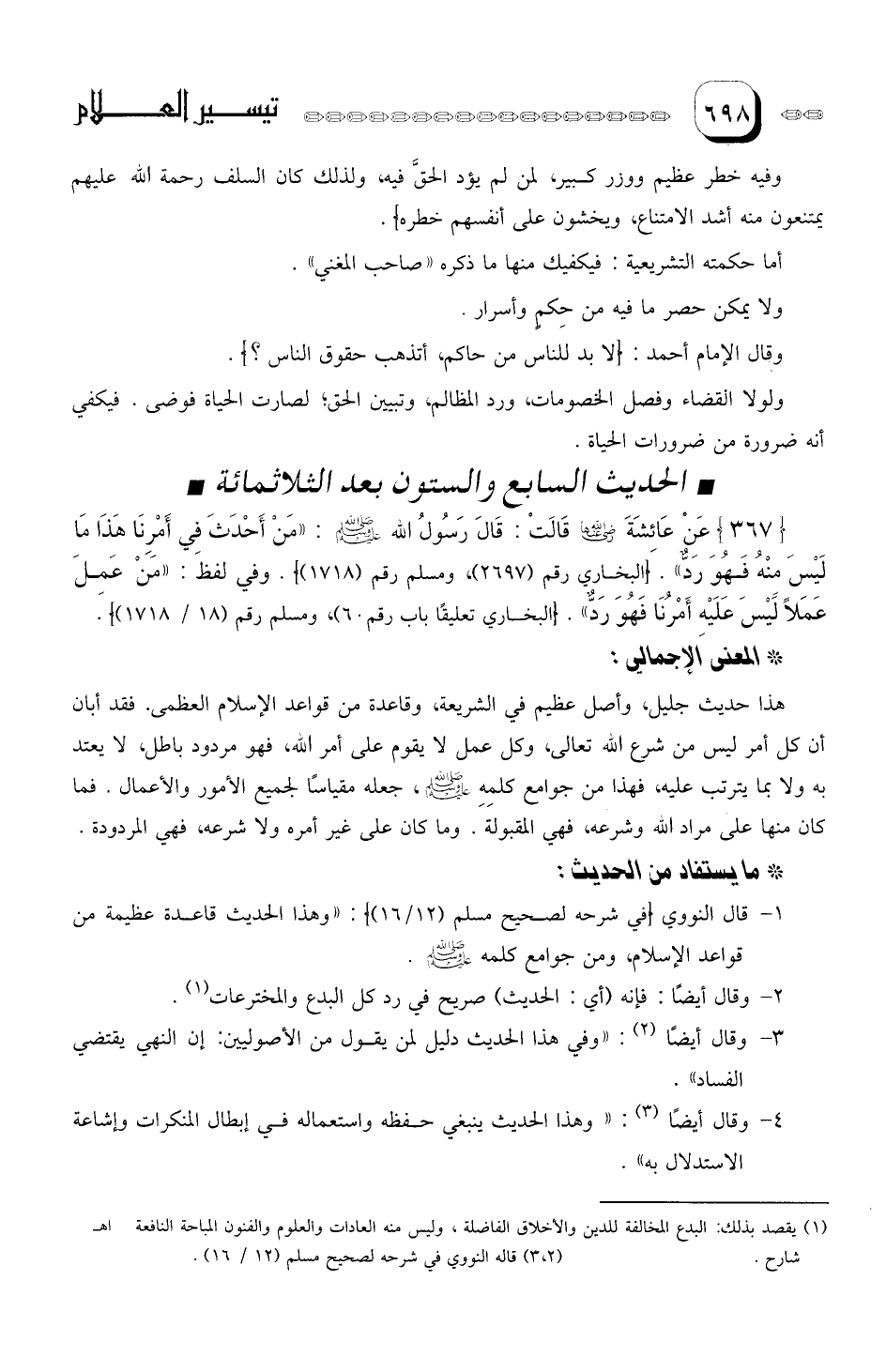 1- قال النووي: " وهذا الحديث قاعدة عظيمة من قواعد الإسلام، ومن جوامع كلمه صلى الله عليه وسلم.